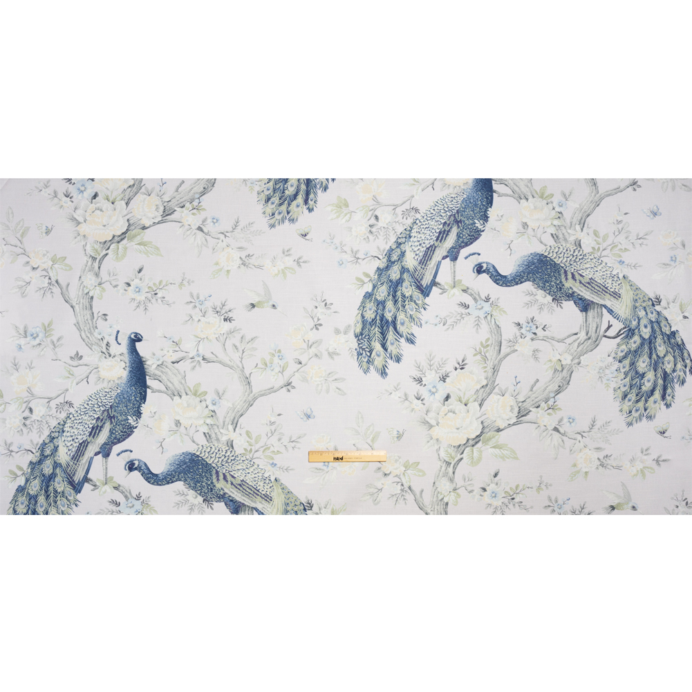 Host an event at your home just to show off this British Imported Midnight Peacocks in the Trees Printed Cotton Canvas! Under a pale lilac-gray sky, a family of regal peacocks perches on flowering trees.