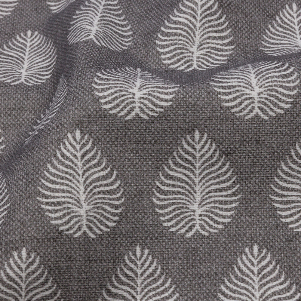 Get your home ready for company with the help of this British Imported Smoke Leaves Printed Cotton Canvas. White palm leaves are printed across a soft yet slightly tactile face. A weave of cotton and linen produces a variation of gray hues and the appearance of slubs, adding to the overall ease that this tropical, lightweight fabric exudes. The malleable drape yields beautiful valances, and long-hanging curtains. Upholster cushions on wicker sofas and chairs, bar stool seat covers, and more! Mostly opaque, a lining is not necessary for most projects.