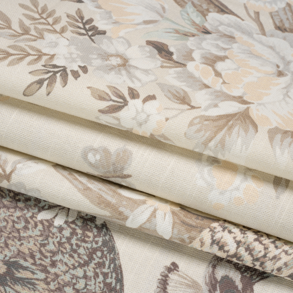 Take pride in your interior design skills with this British Imported Soft Truffle Peacocks in the Trees Printed Cotton Canvas! Under a greige sky, a family of regal peacocks perches on flowering trees. The dry and slubbed hand, semi-structured drape, and slight transparency create a durable work of art for down-to-earth drapery and light upholstery projects.The natural texture of canvas fabrics is rustic in appearance, curating a sense of ease and refinement in your home. This elegant design elevates valances, throw pillows, and headboards—plus, in admiration of its stability, wardrobes can be refreshed with structured jackets and tote bags.