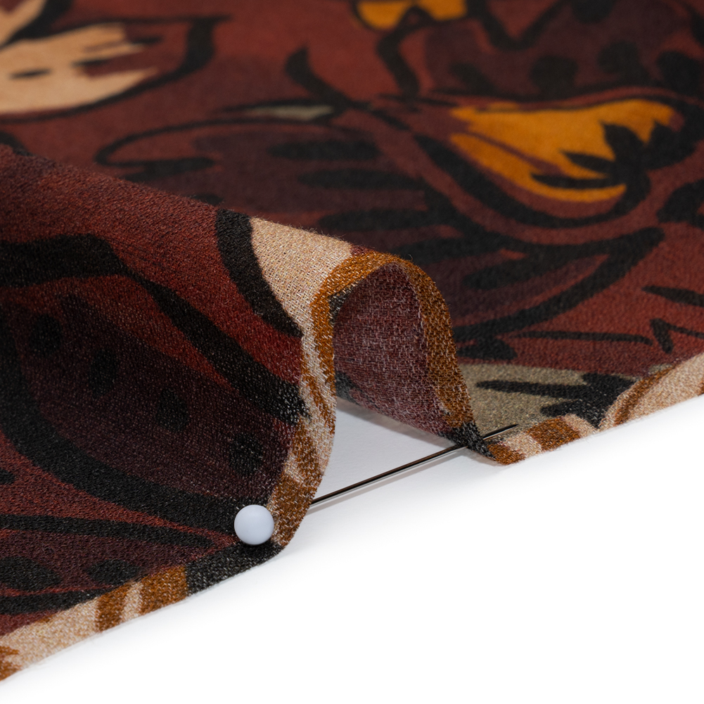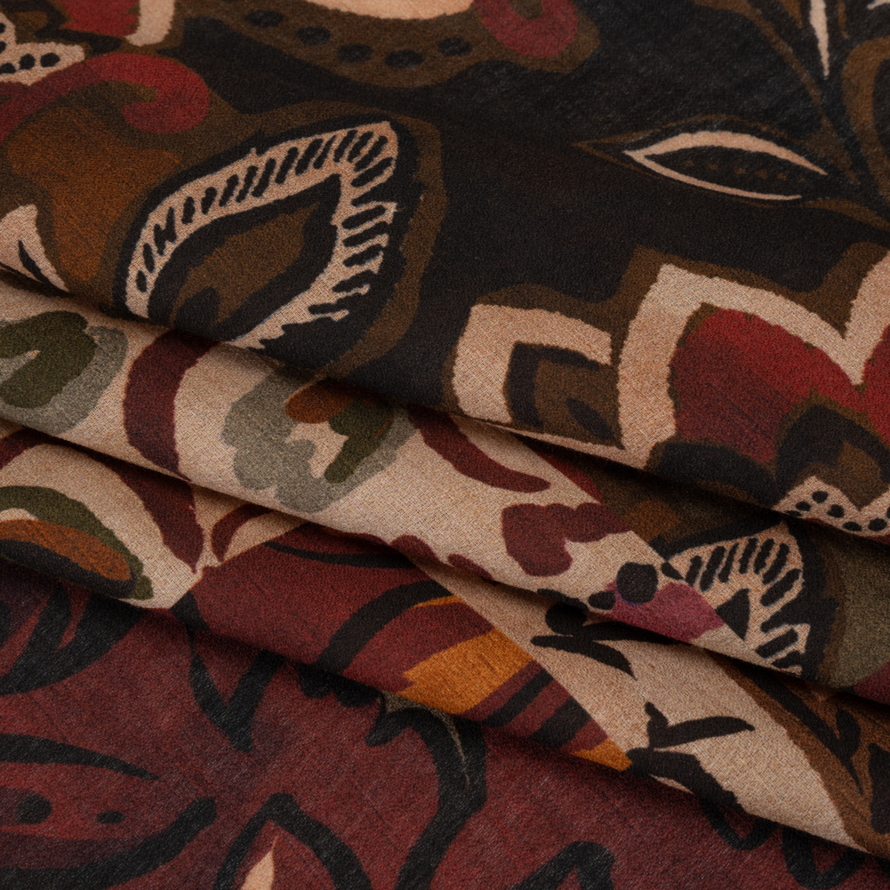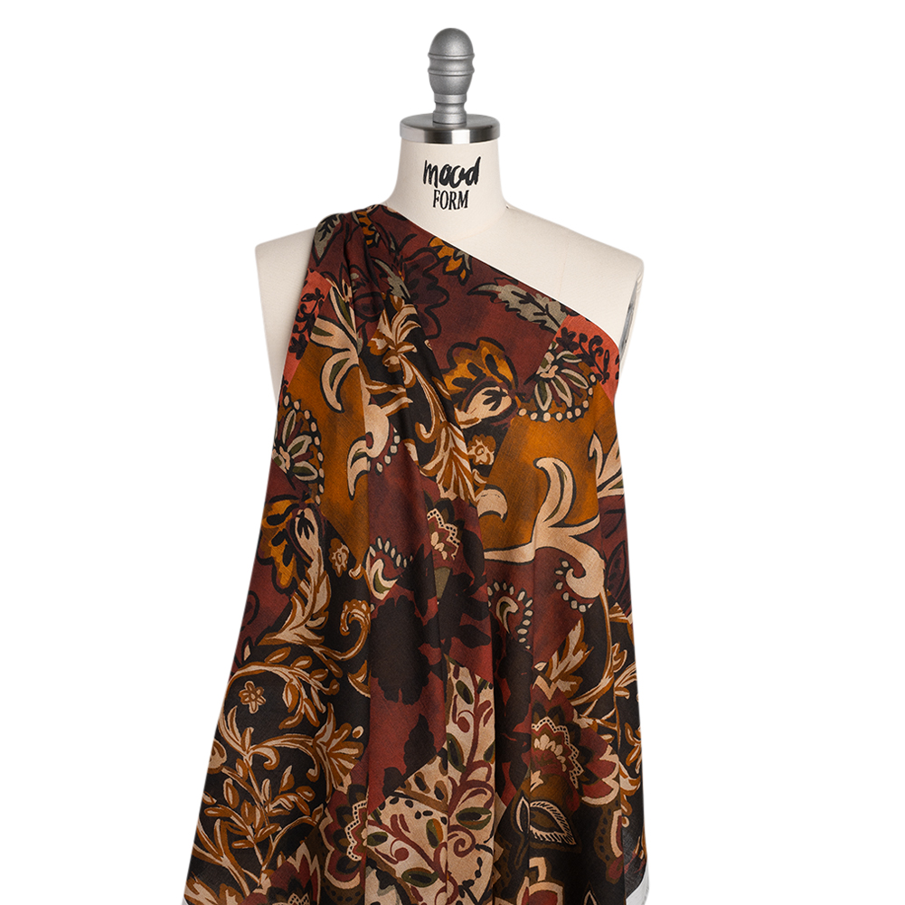 Wine not indulge in a new outfit made of this Mood Exclusive Bordeaux Blossoms Cotton Crepe—featuring a soft, grainy hand and airy drape.Suggested Projects: Blouses, Button-Ups, Skirts, DressesContent: 100% CottonStretch: NoneOpacity: TransparentA floral patchwork weaves across this cotton crepe in rich burgundy, burnt orange, beige, and black—whispering an invitation to sip a glass of red wine and savor the inspiration in every nuanced note. Crafted from 100% cotton, this lightweight crepe offers both comfort and breathability, with a soft, grainy texture that elevates both semi-formal and casual styles. Its airy drape effortlessly creates flowy blouses, wrap skirts, dresses, and more. Transparent and breezy, it may benefit from a lining for added opacity and structure.