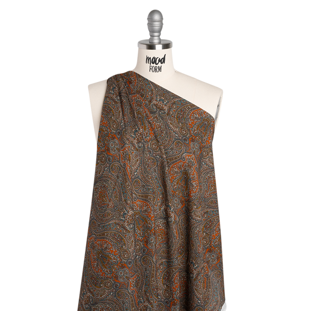 Ideas flow out of this Mood Exclusive Filigree Flow Cotton Crepe—featuring a soft, grainy hand and airy drape.Suggested Projects: Blouses, Button-Ups, Skirts, DressesContent: 100% CottonStretch: NoneOpacity: TransparentLet creative sparks flow as the dark orange, blue, brown, and beige paisley design unfolds across this cotton crepe. Delicate yet intricate, each glance reveals a fresh detail, drawing you deeper into its ever-evolving tapestry. Crafted from 100% cotton, this lightweight crepe offers both comfort and breathability, with a soft, grainy texture that elevates both semi-formal and casual styles. Its airy drape effortlessly creates flowy blouses, wrap skirts, dresses, and more. Transparent and breezy, it may benefit from a lining for added opacity and structure.