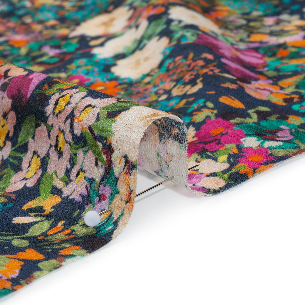 Close your eyes and feel the breeze dance through this Mood Exclusive Wildflower Riot Cotton Crepe—featuring a soft, grainy hand and airy drape.Suggested Projects: Blouses, Button-Ups, Skirts, DressesContent: 100% CottonStretch: NoneOpacity: TransparentAgainst a deep navy backdrop, wildflowers in teal, red-orange, magenta, beige, turquoise, and green blossom in a lively cascade—layering and bursting in a riot of color. They beckon you to sink into their vibrant expanse and let their floral dreams sweep you away. Crafted from 100% cotton, this lightweight crepe offers both comfort and breathability, with a soft, grainy texture that elevates both semi-formal and casual styles. Its airy drape effortlessly creates flowy blouses, wrap skirts, dresses, and more. Transparent and breezy, it may benefit from a lining for added opacity and structure.