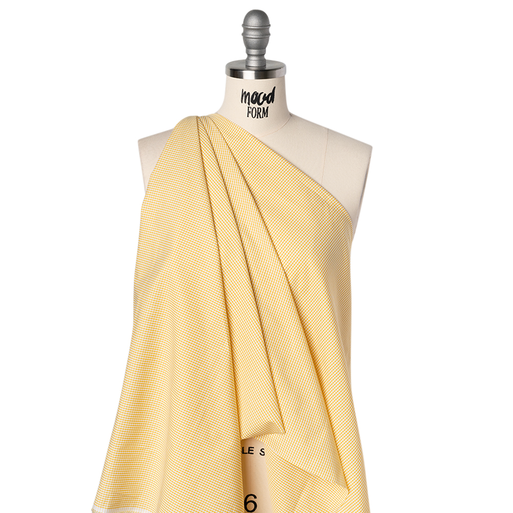 Summer sunshine weaves throughout this Yellow and White Little Checked Cotton Gingham Shirting—featuring a cool, crisp hand and breezy drape.Suggested Projects: Shirts, Dresses, Shorts, SkirtsContent: CottonStretch: NoneOpacity: TranslucentWoven with the warmth of sunshine, this cotton gingham shirting features a cheerful yellow and white petite check that radiates playful charm. With its soft, cool, and slightly crisp hand paired with an airy drape, it’s perfectly suited for warm-weather wear—echoing the carefree notes of sunny summer afternoons. Lightweight, breathable, and thin, it’s ideal for breezy shirt dresses, playful shorts, casual button-ups, and tiered maxi skirts. Translucent, consider adding a lining for increased opacity or extra structure.