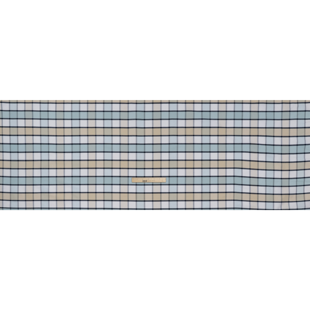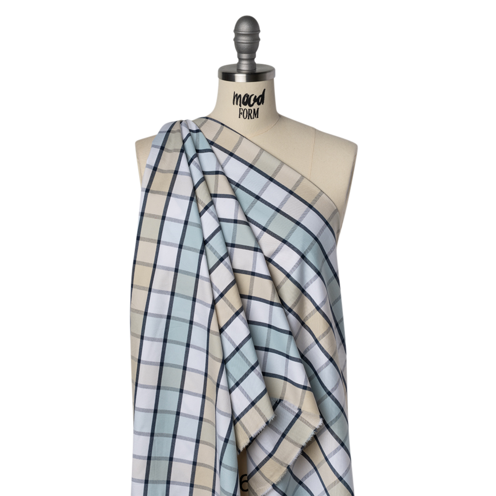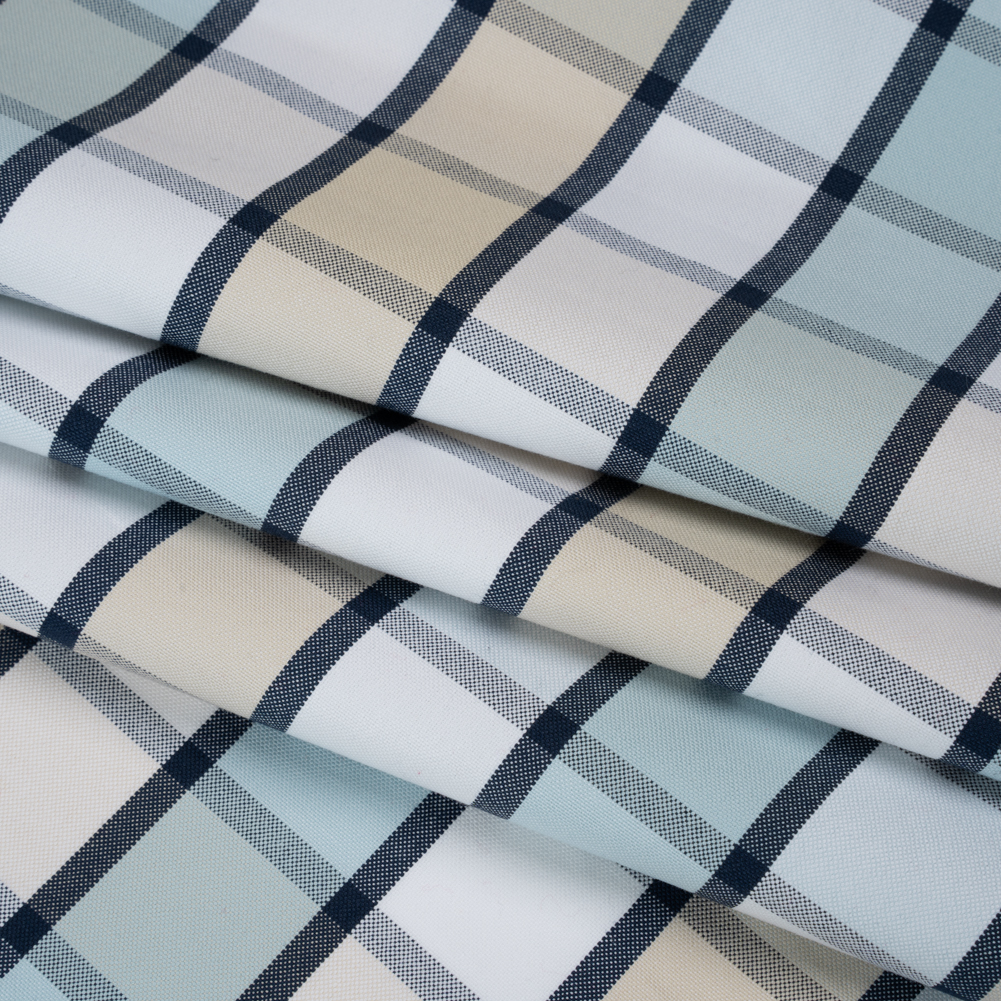 Flit from casual lunches to business meetings in this Beige, Baby Blue and Navy Plaid Cotton Oxford Shirting—featuring a lightly tactile hand and slightly structured drape.Suggested Projects: Button-Ups, Pants, Shorts, DressesContent: CottonStretch: NoneOpacity: Mostly OpaqueBeige, baby blue, and white stripes intersect with navy outlines, creating a crisp and captivating plaid pattern. Thanks to its Oxford construction it boasts a slightly tactile hand and a slightly structured drape—ready to accompany you anywhere you go, whether it’s to work or to bed! With its incredibly comfortable nature, we envision lightweight pajama sets for lounging around the house, blazers with matching trousers to wear into the office, shirt dresses for an afternoon coffee date, and more! Mostly opaque, a lining can be added to increase opacity and structure.