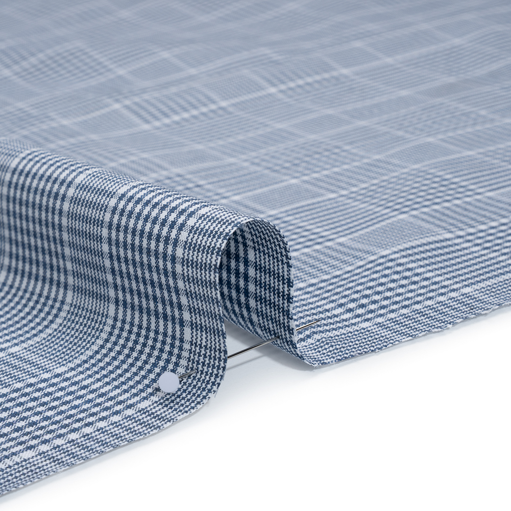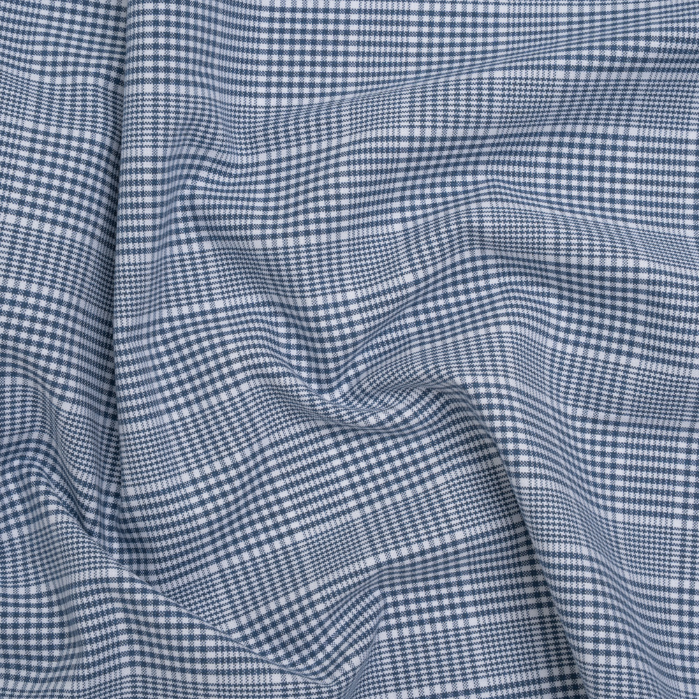 Your style and comfort will remain perfectly balanced with this Blue and White Glen Plaid Cotton Oxford Shirting—featuring a lightly tactile hand and slightly structured drape.Suggested Projects: Button-Ups, Pants, Shorts, DressesContent: 100% CottonStretch: NoneOpacity: Mostly OpaqueStormy blue and crisp white threads intertwine to form a classic glen plaid across this cotton shirting, full of timeless charm and academic aesthetic. Thanks to its Oxford construction it boasts a slightly tactile hand and a slightly structured drape—ready to accompany you anywhere you go, whether it’s to work or to bed! With its incredibly comfortable nature, we envision lightweight pajama sets for lounging around the house, blazers with matching trousers to wear into the office, shirt dresses for an afternoon coffee date, and more! Mostly opaque, a lining can be added to increase opacity and structure.