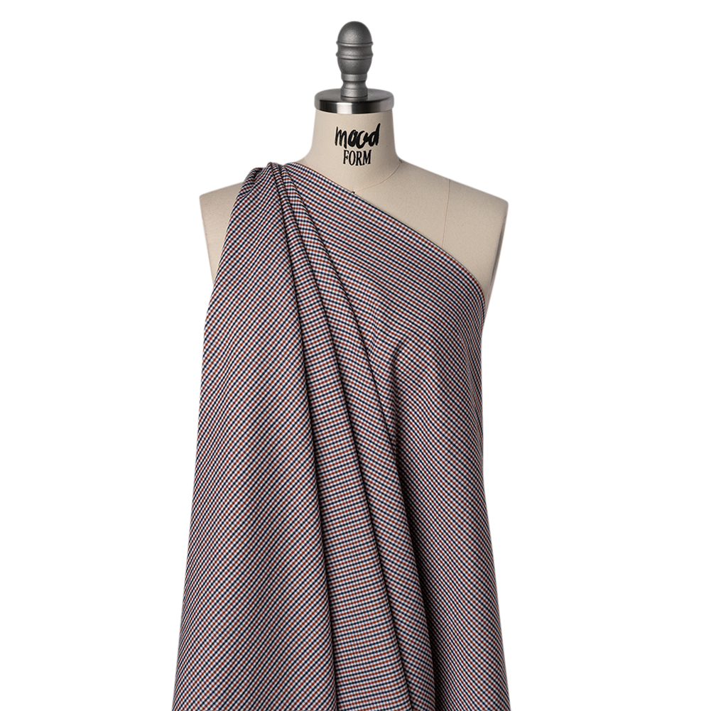 From brisk morning walks to fireside afternoons, this Tattersall Check Cotton Oxford Shirting blends comfort and sophistication effortlessly—featuring a lightly tactile hand and slightly structured drape.Suggested Projects: Button-Ups, Pants, Shorts, DressesContent: CottonStretch: NoneOpacity: OpaqueWarm and inviting, burnt orange, navy blue, and white threads intersect in a subtle tattersall check across this cotton shirting. Thanks to its Oxford construction it boasts a slightly tactile hand and a slightly structured drape—ready to accompany you anywhere you go, whether it’s to work or to bed! With its incredibly comfortable nature, we envision lightweight pajama sets for lounging around the house, blazers with matching trousers to wear into the office, shirt dresses for an afternoon coffee date, and more! Opaque, a lining can be added to increase structure.