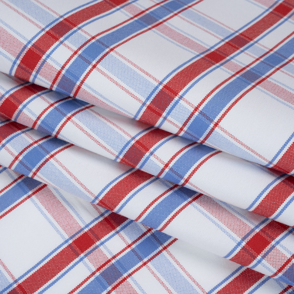 Bring some fun flair to every office outfit with this Plaid Cotton Oxford Shirting—featuring a lightly tactile hand and slightly structured drape.Suggested Projects: Button-Ups, Pants, Shorts, DressesContent: CottonStretch: NoneOpacity: Slightly TranslucentA lively twist on a timeless palette, light blue, bright red, and white threads intersect in a crisp plaid pattern across this cotton shirting. Thanks to its Oxford construction it boasts a slightly tactile hand and a slightly structured drape—ready to accompany you anywhere you go, whether it’s to work or to bed! With its incredibly comfortable nature, we envision lightweight pajama sets for lounging around the house, blazers with matching trousers to wear into the office, shirt dresses for an afternoon coffee date, and more! Slightly translucent, a lining can be added to increase opacity and structure.