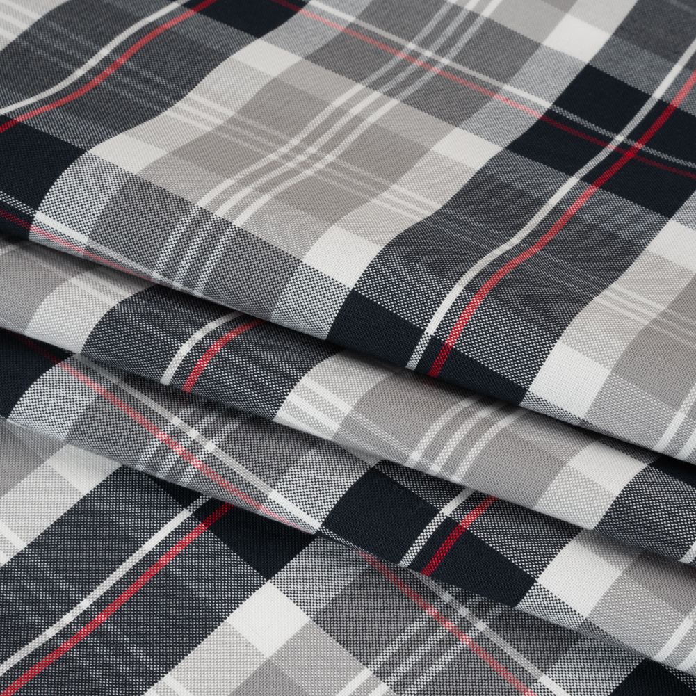 Repose with a good book in this Midnight Navy, Light Gray and Red Plaid Cotton Oxford Shirting—featuring a soft, slightly tactile hand and crisp drape.
