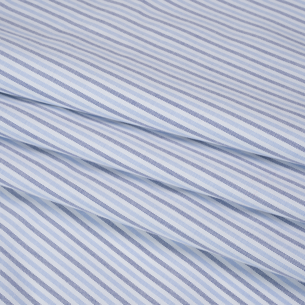 Refresh your workwear with comfy staples using this Candy Striped Cotton Oxford Shirting—featuring a lightly tactile hand and slightly structured drape.Suggested Projects: Button-Ups, Pants, Shorts, DressesContent: CottonStretch: NoneOpacity: Slightly TranslucentSky blue, deep blue, and white candy stripes race across this cotton shirting, creating a refreshing pattern that feels effortlessly cool and classic. Thanks to its Oxford construction it boasts a slightly tactile hand and a slightly structured drape—ready to accompany you anywhere you go, whether it’s to work or to bed! With its incredibly comfortable nature, we envision lightweight pajama sets for lounging around the house, blazers with matching trousers to wear into the office, shirt dresses for an afternoon coffee date, and more! Slightly translucent, a lining can be added to increase opacity and structure.