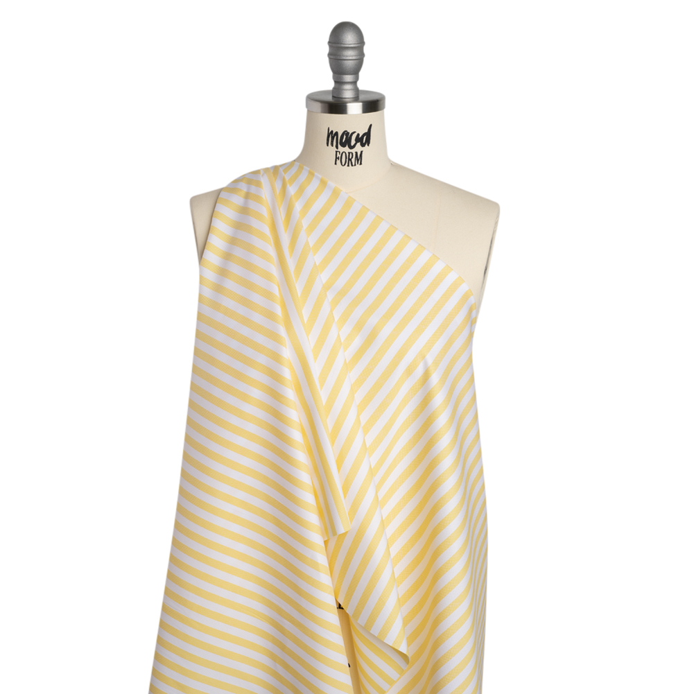 It’ll always be a sunny day when you wear this Sunny Yellow and White Striped Cotton Oxford Shirting—featuring a soft, slightly tactile hand and crisp drape.Suggested Projects: Button-Ups, Pants, Shorts, DressesContent: 100% CottonStretch: NoneOpacity: Slightly TranslucentBright yellow rays of sun shine across this white shirting. Thanks to its Oxford construction it boasts a soft, slightly tactile hand and crisp drape—ready to accompany you anywhere you go, whether it’s to work or to bed! With its incredibly comfortable nature, we envision lightweight pajama sets for lounging around the house, button-downs to brighten up your time in the office, shirt dresses for an afternoon coffee date, and more! Slightly translucent, a lining may be added to increase opacity and structure.