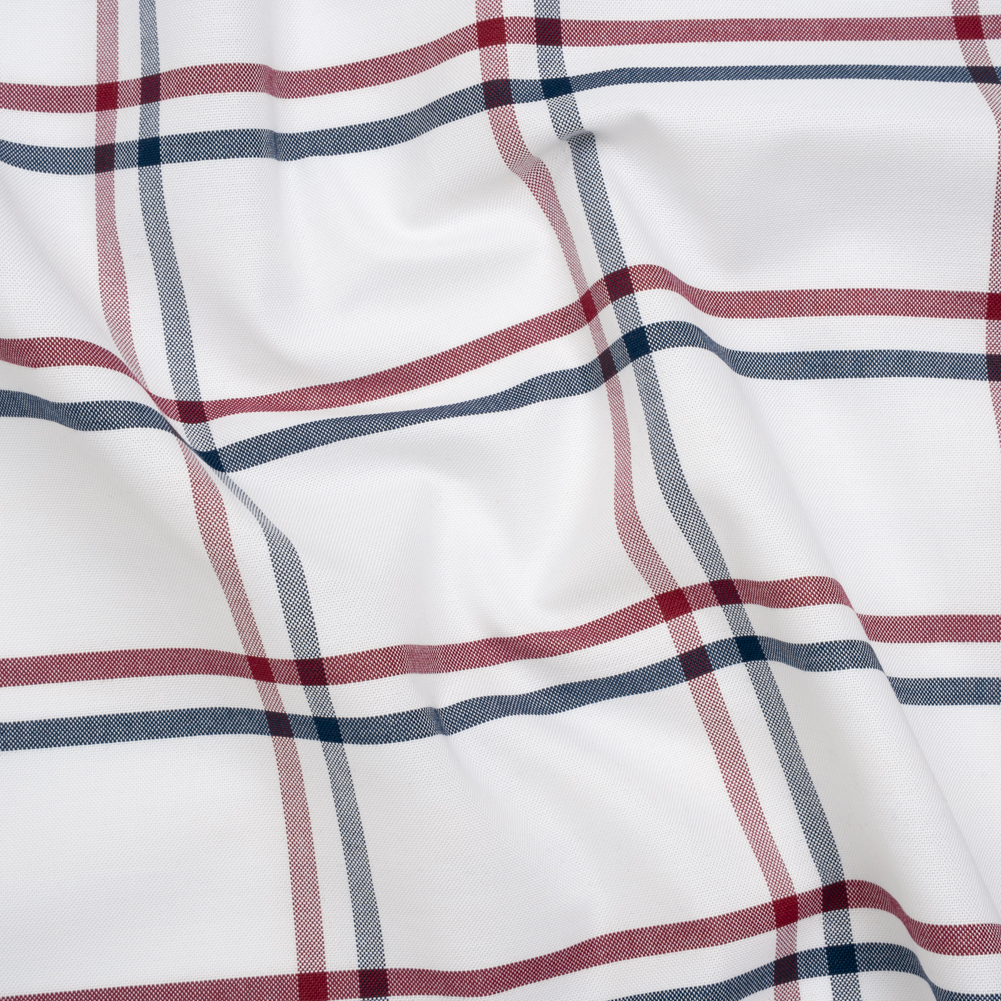 This Open Plaid Cotton Oxford Shirting will open up a whole new portfolio of project possibilities—featuring a lightly tactile hand and slightly structured drape.Suggested Projects: Button-Ups, Pants, Shorts, DressesContent: CottonStretch: NoneOpacity: Slightly TranslucentNavy and dark red threads intersect in a clean, open plaid pattern atop a crisp white background. Thanks to its Oxford construction it boasts a slightly tactile hand and a slightly structured drape—ready to accompany you anywhere you go, whether it’s to work or to bed! With its incredibly comfortable nature, we envision lightweight pajama sets for lounging around the house, blazers with matching trousers to wear into the office, shirt dresses for an afternoon coffee date, and more! Slightly translucent, a lining can be added to increase opacity and structure.