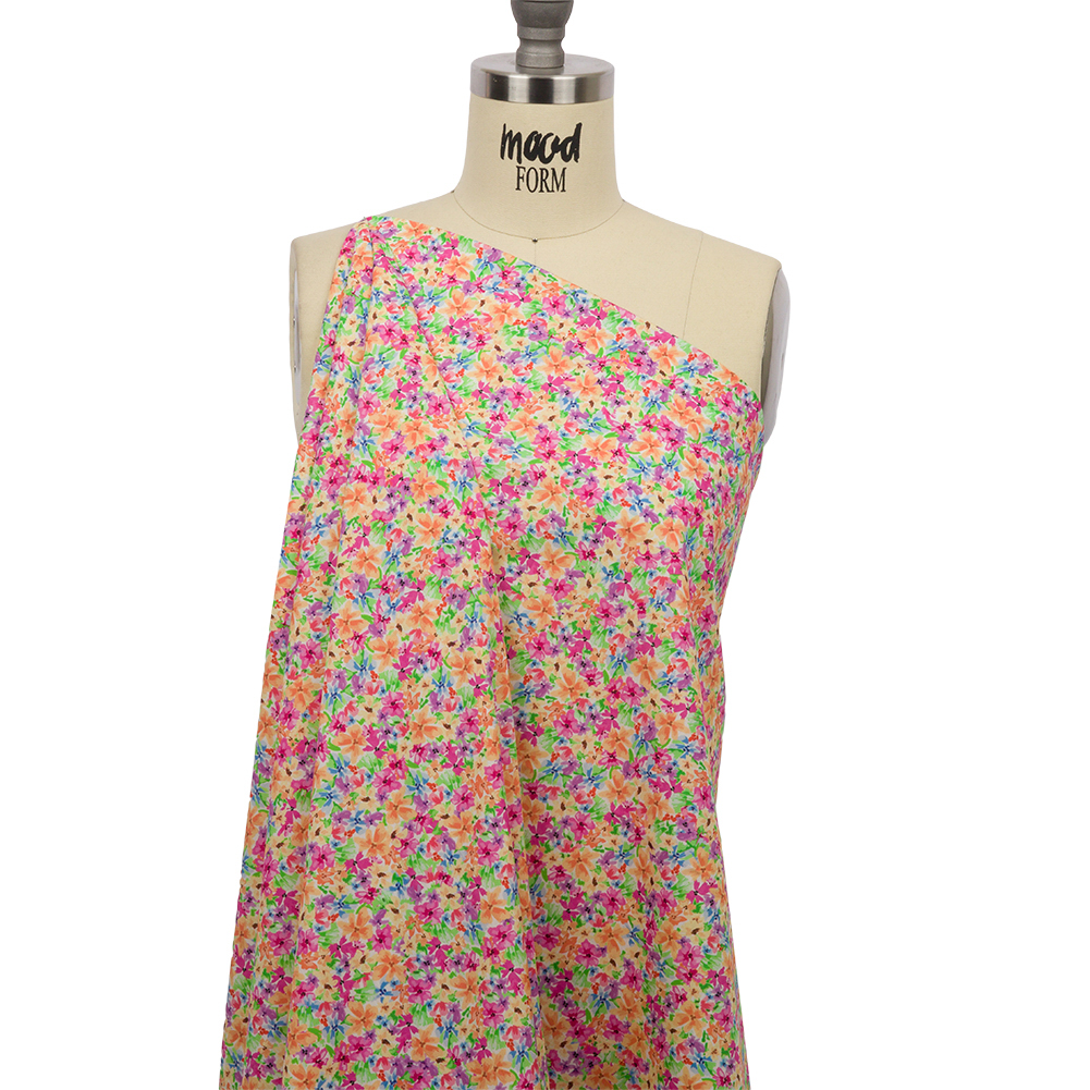 Lush landscapes, drenched in vibrant gardens, color the Isola Bella. Our Mood Exclusive Pink Isola Bella Cotton Poplin displays the beauty of this Italian island in watercolor flowers of pink, blue, and orange hues. Cotton poplin, a perfect warm-weather fabric, has a crisp, cool hand and a structured feel. With wrinkle-resistant properties, it is great for blouses, button-up shirts, shirts, and dresses. Slightly translucent, a lining may be necessary where full opacity is desired.Explore Mood’s flower shop: The Secret Garden Collection is an aromatic assembly of bouquets and fields and gardens, sprawling with life and buzzing with color. Get picking!