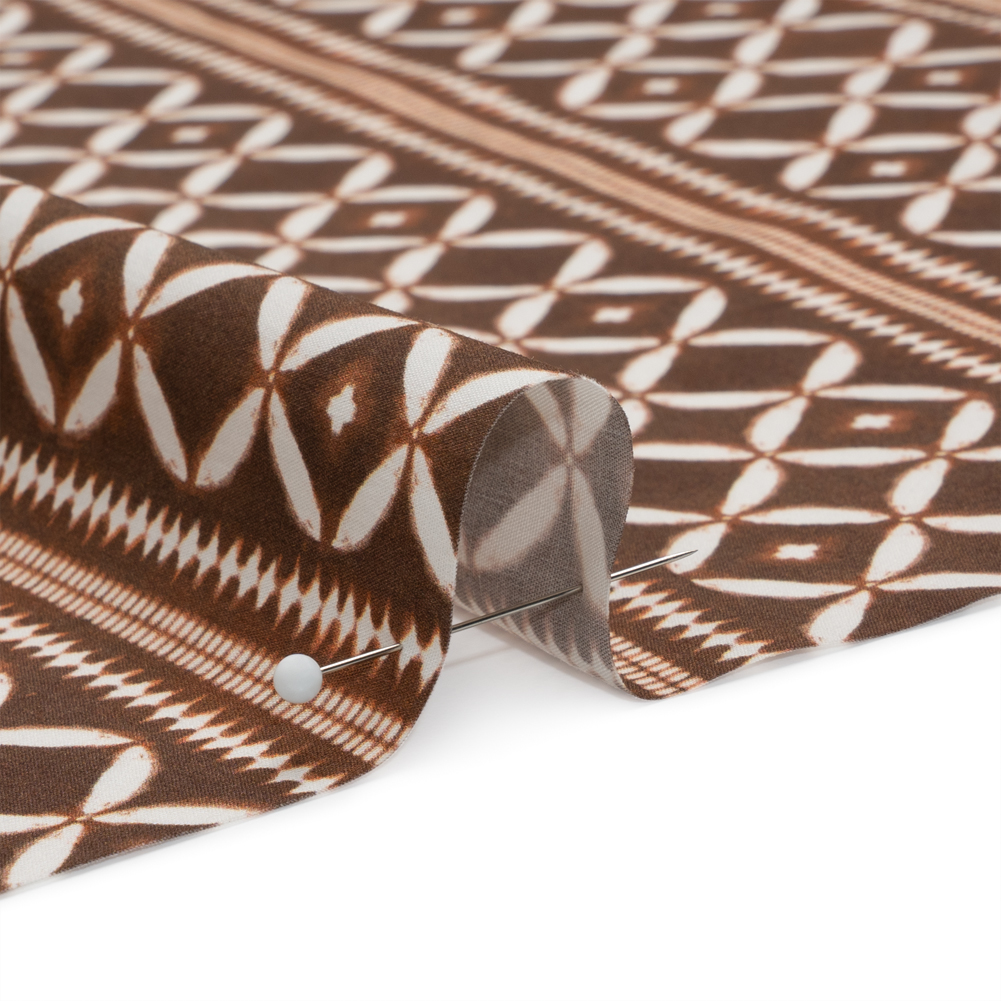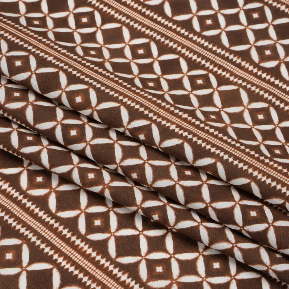 Take home our Mood Exclusive Brown Back to Back Cotton Poplin, where white circles and diamonds fall into organized coloumns against a slightly discolored brown background. Owning a dry hand, this fabric falls with a crisp drape and features a very slight give through the weft. As it is semi-translucent, a lining may be desired.Warm weather or cold, casual or semi-formal—cotton poplin lends a chic attitude to every closet, promoting clean silhouettes and elevated basics. The lightweight and cool feel is great for shirting; boxy cropped tops, button-ups, and shirt dresses are just the beginning of what you can create with this fabric!