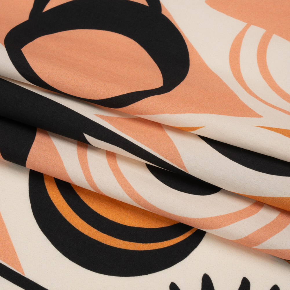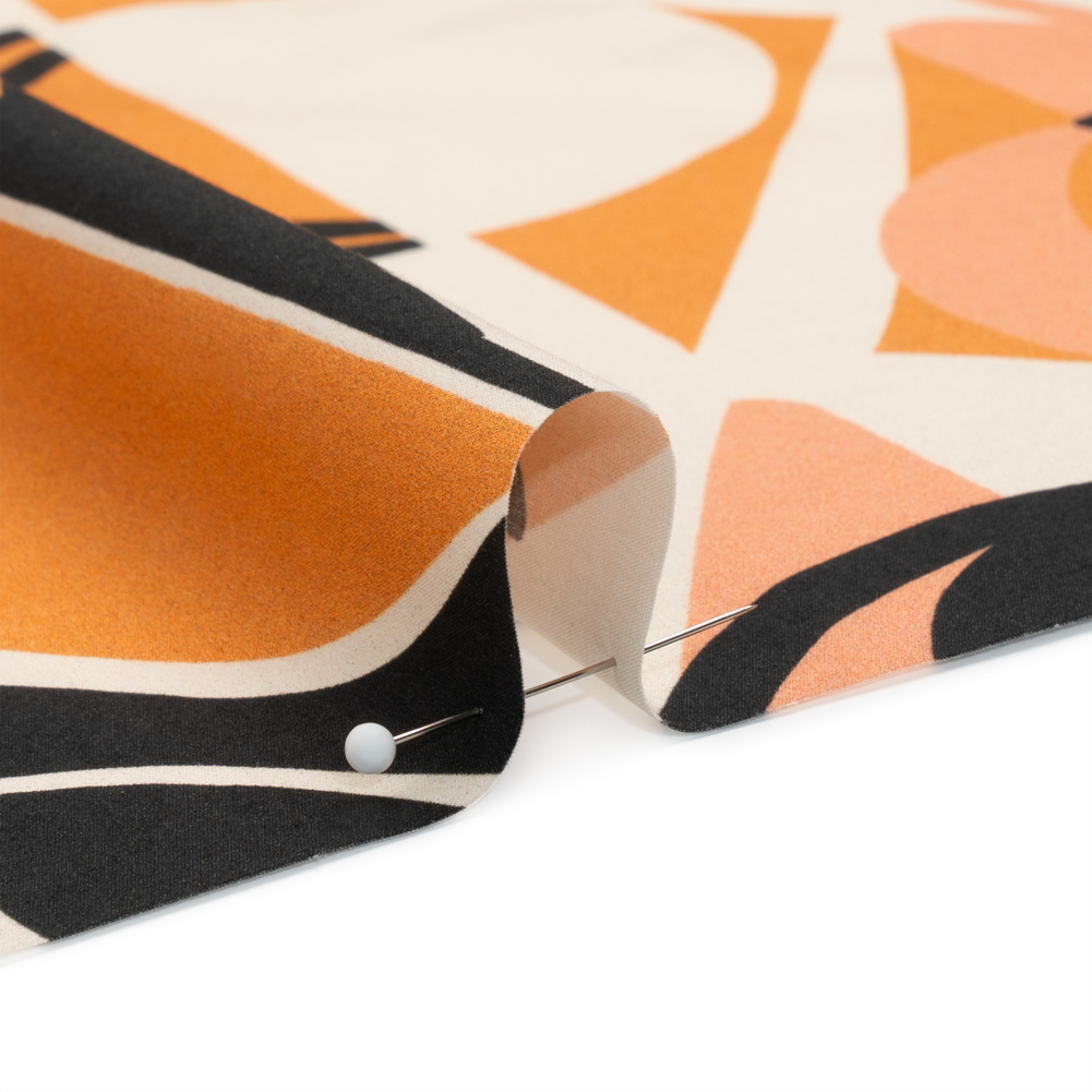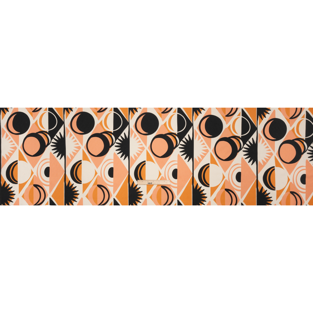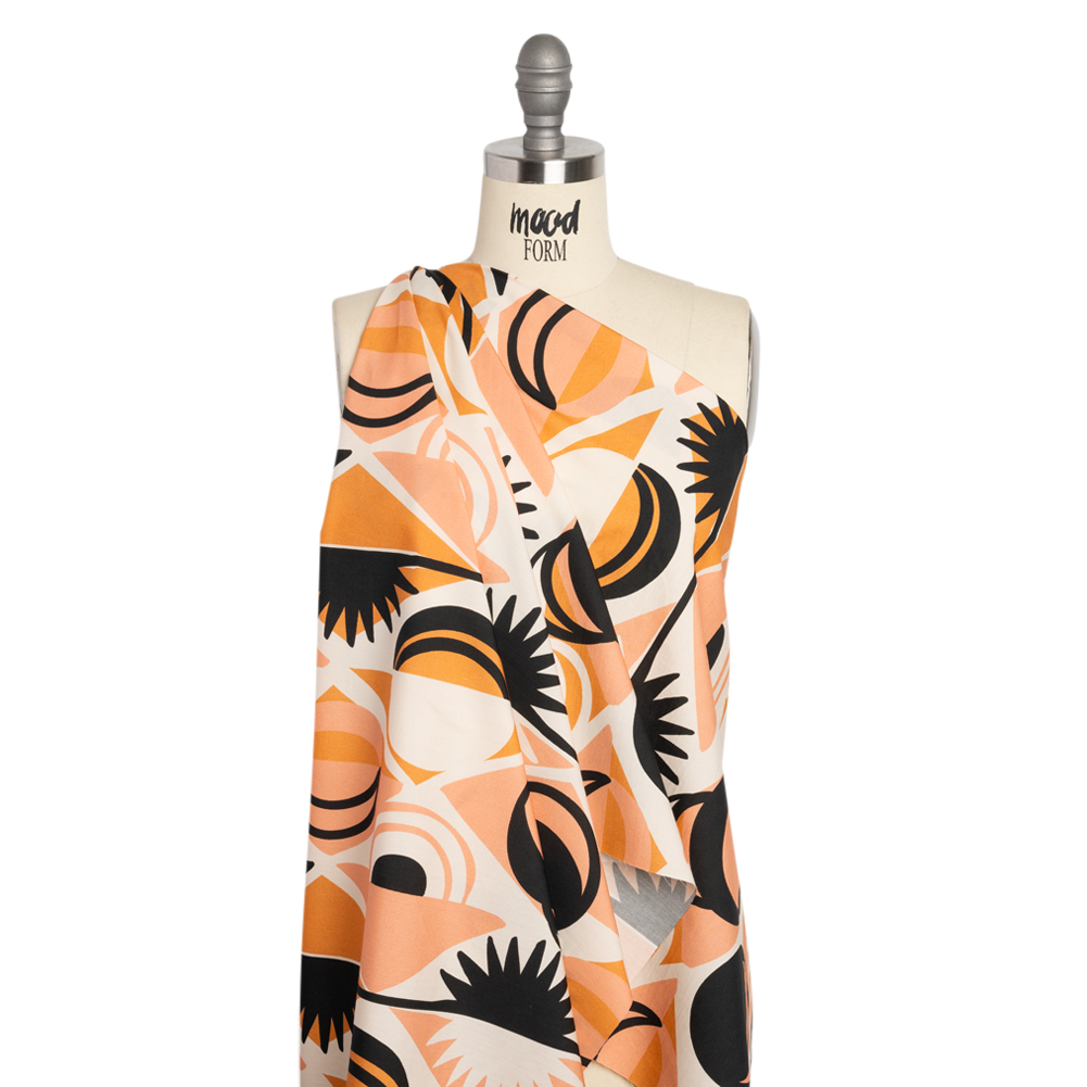 Our Mood Exclusive Orange Twinkle Twinkle Cotton Poplin exists between moonlight and starshine. Peach, orange, and black tiles form diamonds against a white background as celestial shapes decorate the foreground. Owning a dry hand, this fabric falls with a crisp drape and features a very slight give through the weft. As it is semi-translucent, a lining may be desired.Warm weather or cold, casual or semi-formal—cotton poplin lends a chic attitude to every closet, promoting clean silhouettes and elevated basics. The lightweight and cool feel is great for shirting; boxy cropped tops, button-ups, and shirt dresses are just the beginning of what you can create with this fabric!