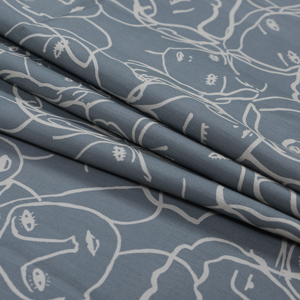 The song "I've Just Seen a Face" comes to mind when gazing upon our Mood Exclusive Un Dia en Andorra Steel Gray Cotton Poplin. Titled "A Day in Andorra," this print was inspired by the small country nestled between Spain and France which features a sculpture of the famous Salvador Dali melted clock. A hub of artistic expression, get lost in the Picasso-esque faces featured in this print. Its crisp hand gives the contemporary piece a polished look. Presenting a flexible drape, create midi dresses, oxford shirts and paneled tops. A bit of mechanical give adds more flexibility to tailored pieces as well. Thin and lightweight, the breathable woven is ideal for spring and summer. Translucent, insert a lining for more opacity.
