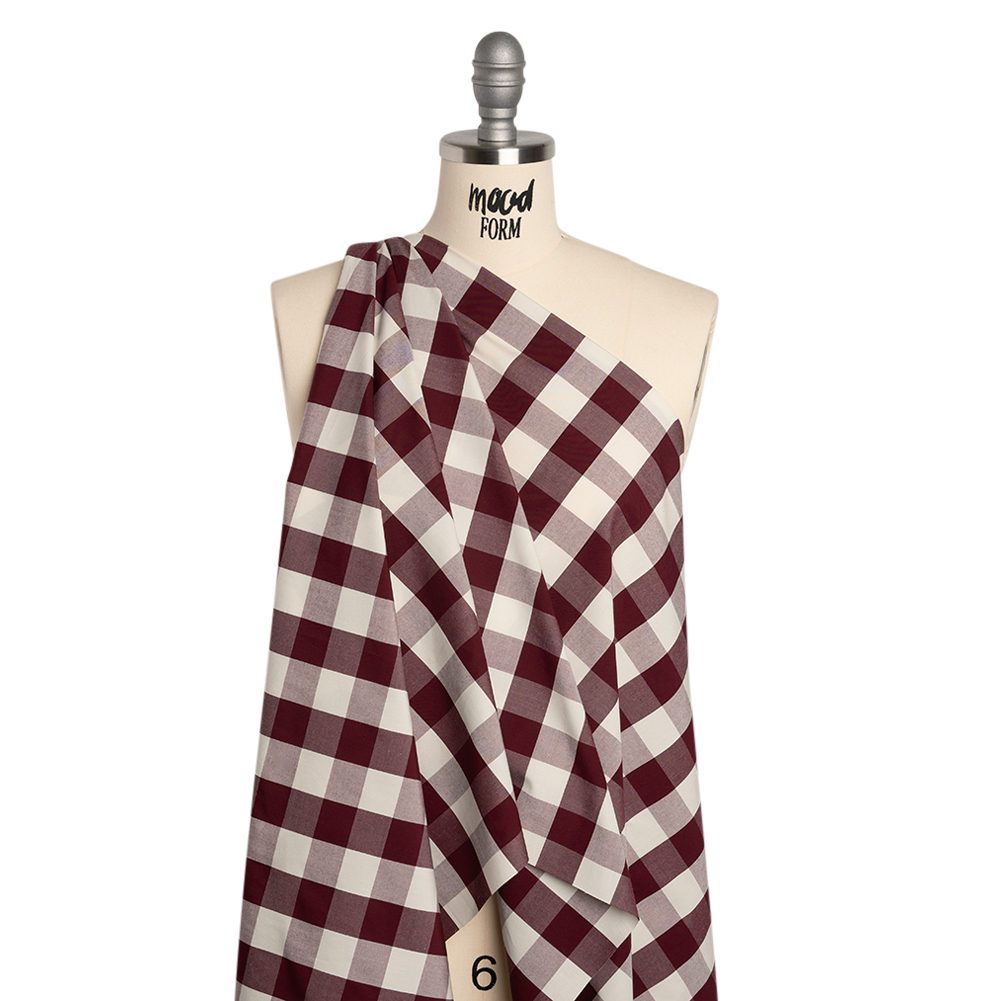A glass of wine after a long day at work is the perfect companion to this Burgundy and Cream Buffalo Check Cotton Shirting—featuring a crisp, cool hand and airy drape.Suggested Projects: Shirts, Skirts, Dresses, ShortsContent: CottonStretch: NoneOpacity: TranslucentThe burgundy and cream buffalo check design of this shirting exudes the ease of days spent at your forest home, resting beside a campfire and grilling to your heart’s content. Thin and lightweight, this shirting has a crisp, cool hand and an airy drape that inspires casual and breathable styles. Whether it be a classic button down, a short, pleated skirt, or a smart blouse, the plaid design of this shirting lends itself well to long days outside, enjoying the fresh air. Translucent, a lining is suggested for more opacity and structure.