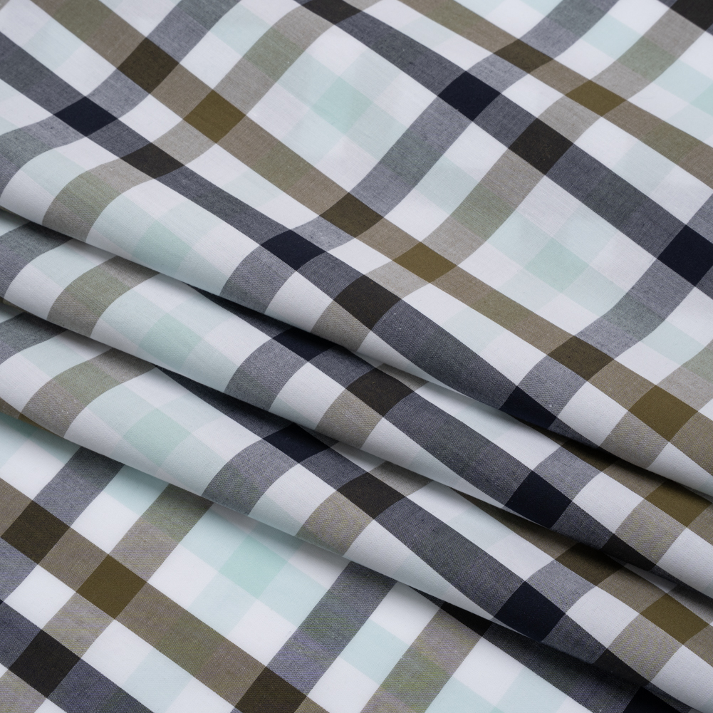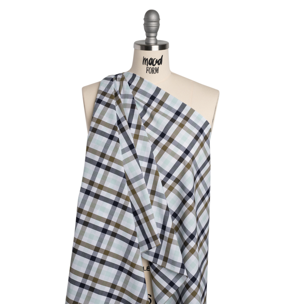Easily transition from the office to date night with this Khaki, Navy and Light Aqua Blue Plaid Cotton Shirting—featuring a crisp, cool hand and crisp drape.Suggested Projects: Shirts, Skirts, Dresses, ShortsContent: CottonStretch: NoneOpacity: Slightly TranslucentKhaki, navy, and light aqua blue lines overlap atop this white cotton shirting in an orderly plaid design. Thin and lightweight, this shirting has a crisp, cool hand and a crisp drape that inspires casual and breathable styles. Whether it be a classic button down, a short, pleated skirt, or a smart blouse, the plaid design of this shirting lends itself well to long days outside, enjoying the fresh air. Slightly translucent, a lining is suggested for more opacity and structure.