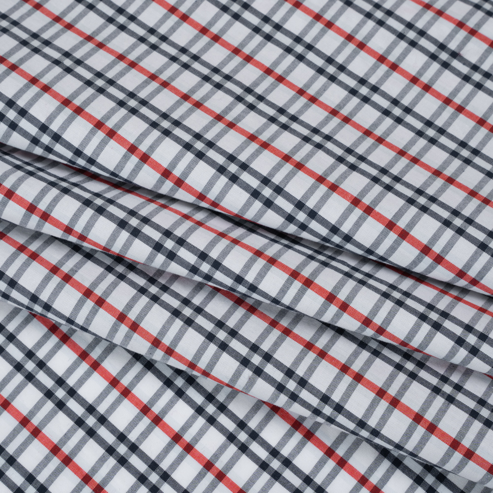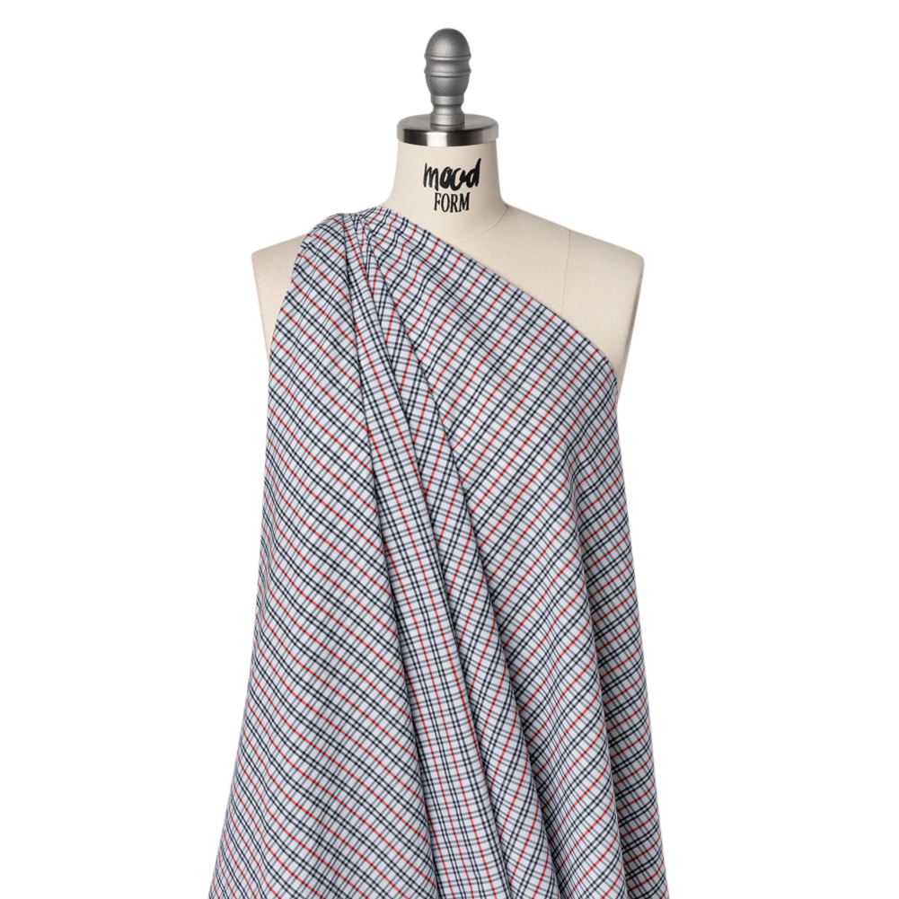 Sew classic work couture with this Midnight Navy, Red and White Plaid Cotton Shirting—featuring a cool, smooth hand and fluid drape.