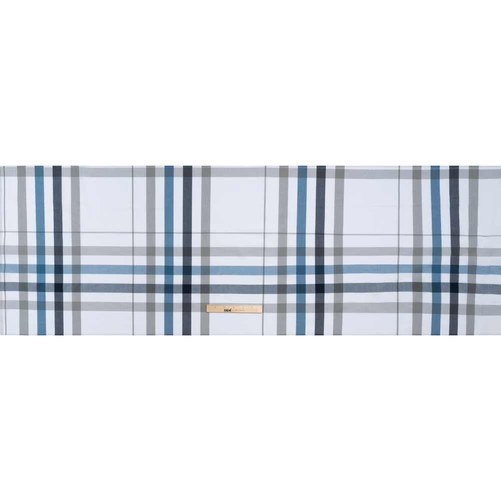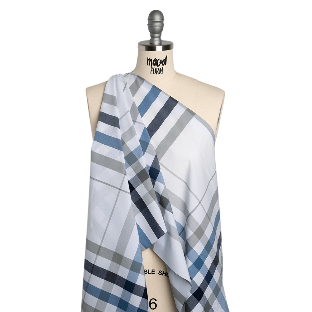 Sew up a storm with this Navy, Blue and Gray Big Plaid Cotton Shirting—featuring a crisp, cool hand and airy drape.Suggested Projects: Shirts, Skirts, Dresses, ShortsContent: CottonStretch: NoneOpacity: TranslucentA big plaid design unfurls atop this white shirting in stripes of navy, blue, and gray. Thin and lightweight, this shirting has a crisp, cool hand and an airy drape that inspires casual and breathable styles. Whether it be a classic button down, a short, pleated skirt, or a smart blouse, the plaid design of this shirting lends itself well to long days outside, enjoying the fresh air. Translucent, a lining is suggested for more opacity and structure.