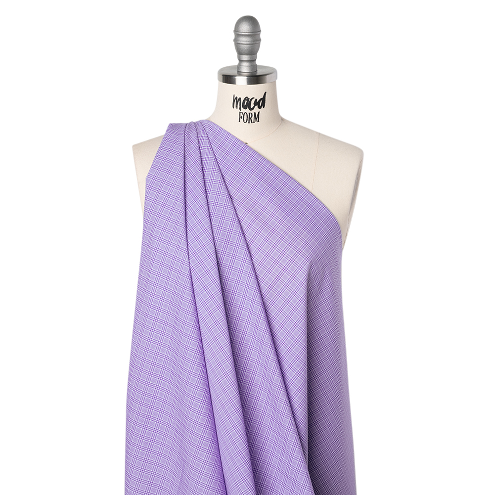 Your favorite color can join you in the office with this Purple and White Plaid Cotton Shirting—featuring a cool, smooth hand and crisp drape.Suggested Projects: Button-Ups, Tops, Dresses, SkirtsContent: CottonStretch: NoneOpacity: Slightly TranslucentPurple and white threads weave a delicate, narrow striped pattern across this fabric. Thin and lightweight, this shirting features a cool, smooth hand and a crisp drape that inspires effortlessly breathable designs. From classic button-downs to pleated mini skirts or fit-and-flare summer dresses, its easygoing pattern evokes days spent outdoors in warm sunlight and soft breezes. Slightly translucent, a lining is recommended for added opacity and structure.