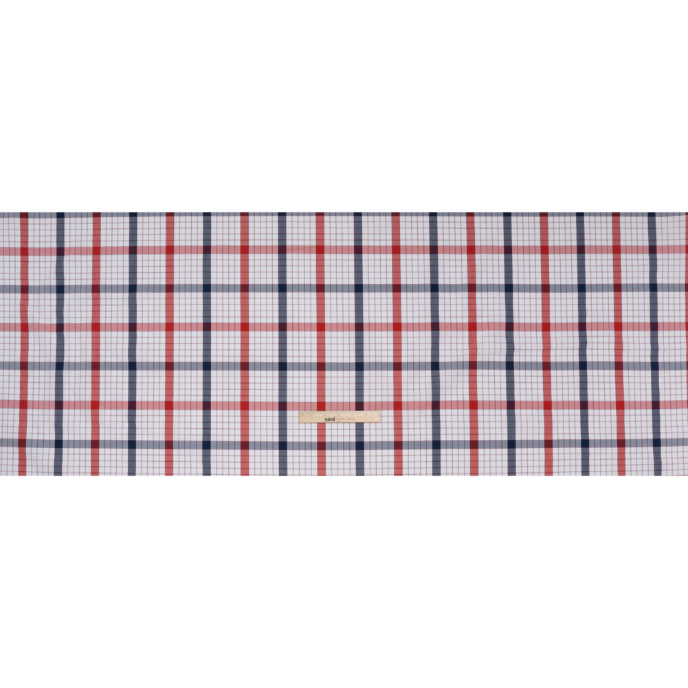 Check out this Checked Plaid Cotton Shirting for your next workwear creation—featuring a smooth, cool hand and crisp drape.Suggested Projects: Shirts, Shorts, Skirts, VestsContent: CottonStretch: NoneOpacity: Slightly TranslucentBold red and navy stripes, accented by finer lines in the same hues, intersect to form a striking checked plaid across this crisp white cotton shirting. Lightweight and smooth with a cool hand and crisp drape, it’s perfect for breezy, casual styles—think classic button-downs, pleated skirts, and tailored vests fit for sunny days outdoors. Slightly translucent, a lining can be added for opacity and structure.