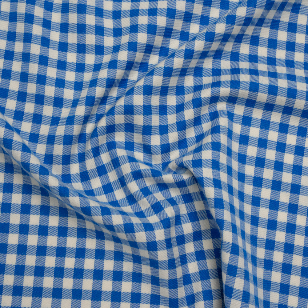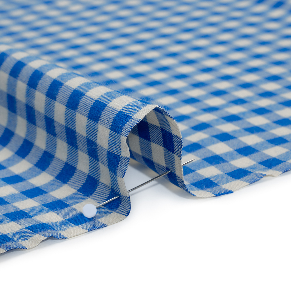 Dive into the coziest of creations with this Cerulean Blue and Cream Gingham Check Cotton Twill Flannel—featuring a soft, fuzzy hand and supple drape.Suggested Projects: Button-Ups, Lightweight Jackets, Pants, SkirtsContent: 100% CottonStretch: NoneOpacity: Mostly OpaqueCerulean blue and cream threads form a warm, inviting gingham check across this cotton twill flannel. With an ultra-soft, fuzzy hand courtesy of a brushed finish and a supple, flowing drape, this flannel is an even cozier take on an already soft classic. Ideal for comfy, casual creations you’ll never want to take off, imagine sleek button-ups for apple picking, wide-leg lounge pants for relaxing at home, chic pleated skirts for coffee dates, or lightweight jackets to add comfort to your office days. Mostly opaque, a lining can be added for extra structure and warmth.