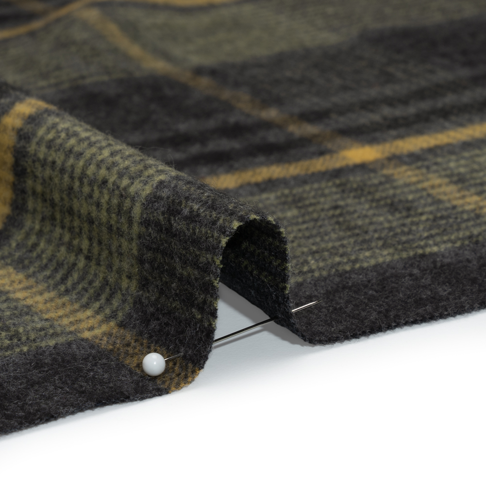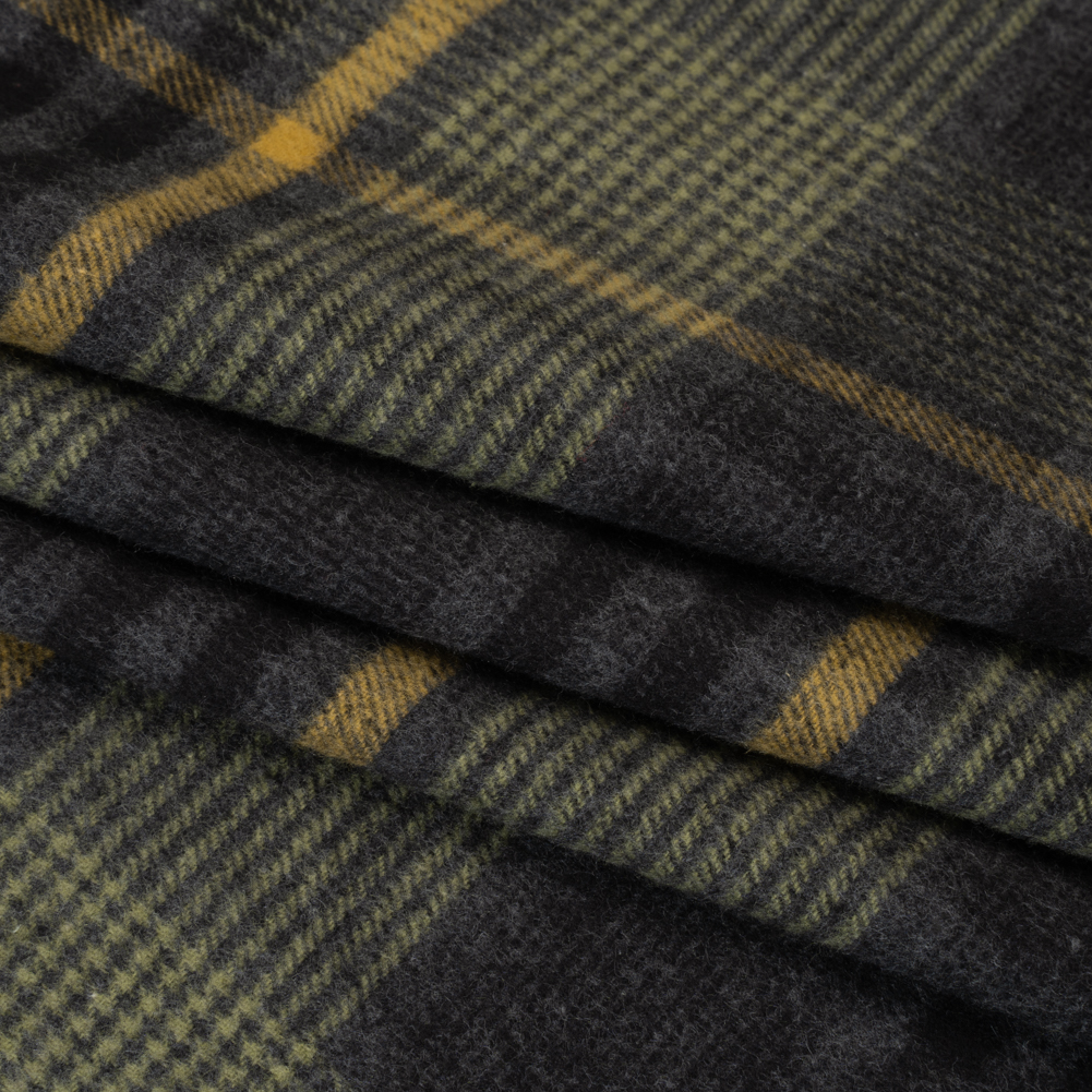 Walk beneath autumn’s changing leaves in this Plaid Cotton Twill Flannel, featuring an ultra-soft hand and supple drape.Suggested Projects: Lightweight Jackets, Shirts, Dresses, SkirtsContent: 100% CottonStretch: NoneOpacity: Mostly OpaqueBlack, light olive, and mustard yellow lines overlap in a breathtaking plaid pattern atop a charcoal background. With a 100% cotton composition, this fabric underwent a brushed finishing technique, resulting in a fuzzy face and elevating the already soft qualities of flannel. Its medium-weight and supple drape are perfect for a range of sewing projects: comfortably create button-up shirts, wrap-around dresses, structured cardigans, and other cold-weather garments. Mostly opaque, a lining isn’t necessary but may be added for increased structure and opacity.