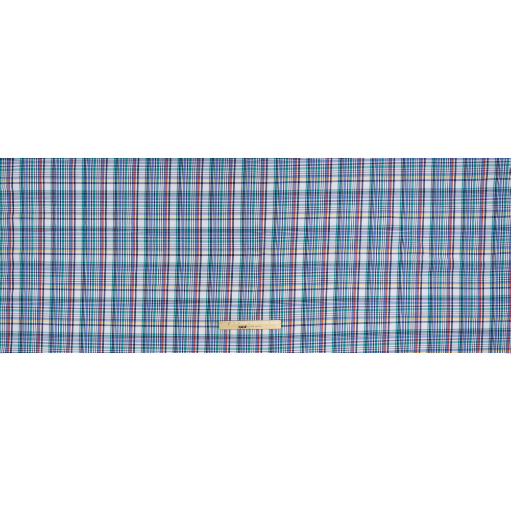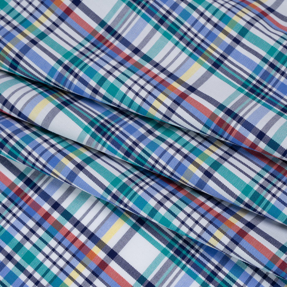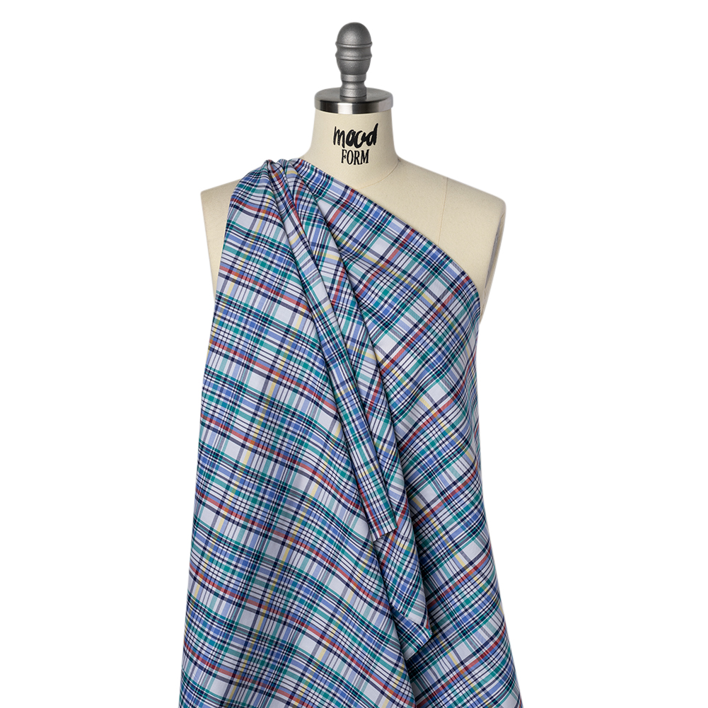 Colorful creations are right at your fingertips with this Colorful Plaid Cotton Twill Shirting—featuring a smooth, dry hand and supple drape.Suggested Projects: Shirts, Shorts, Skirts, VestsContent: CottonStretch: NoneOpacity: Mostly OpaqueCraft vibrant, eye-catching pieces with this cotton twill shirting, where blue, teal, navy, yellow, and red stripes race and overlap across a crisp white backdrop. Woven from soft cotton fibers, this shirting combines breathable comfort with a durable twill weave and a lightweight, supple drape. Ideal for preppy button-downs, chic shirt dresses, statement shorts, or pleated skirts, it adds a touch of playful polish to everyday outfits. Mostly opaque, a lining can be added for extra structure.