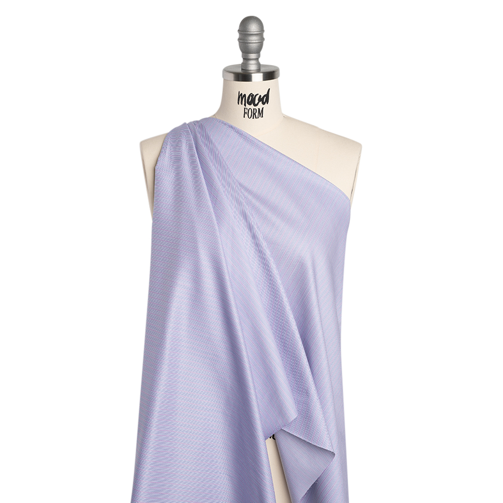 This Dark Blue, Lavender and White Striped Cotton Twill Shirting has no dark designs—featuring a soft, crisp hand and crisp drape.Suggested Projects: Shirts, Blouses, Shorts, VestsContent: CottonStretch: NoneOpacity: Mostly OpaqueAtop a white backdrop, thin dark blue and lavender stripes race across this cotton twill shirting. Composed of cotton fibers, this shirting is breathable, crisp, and soft in hand, with a twill weave adding durability and a lightweight, crisp drape. Try preppy button-downs and blouses, or even vests, statement shorts, and pleated skirts. Though mostly opaque, a lining can be added to increase opacity and structure.