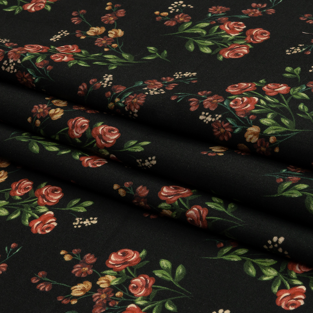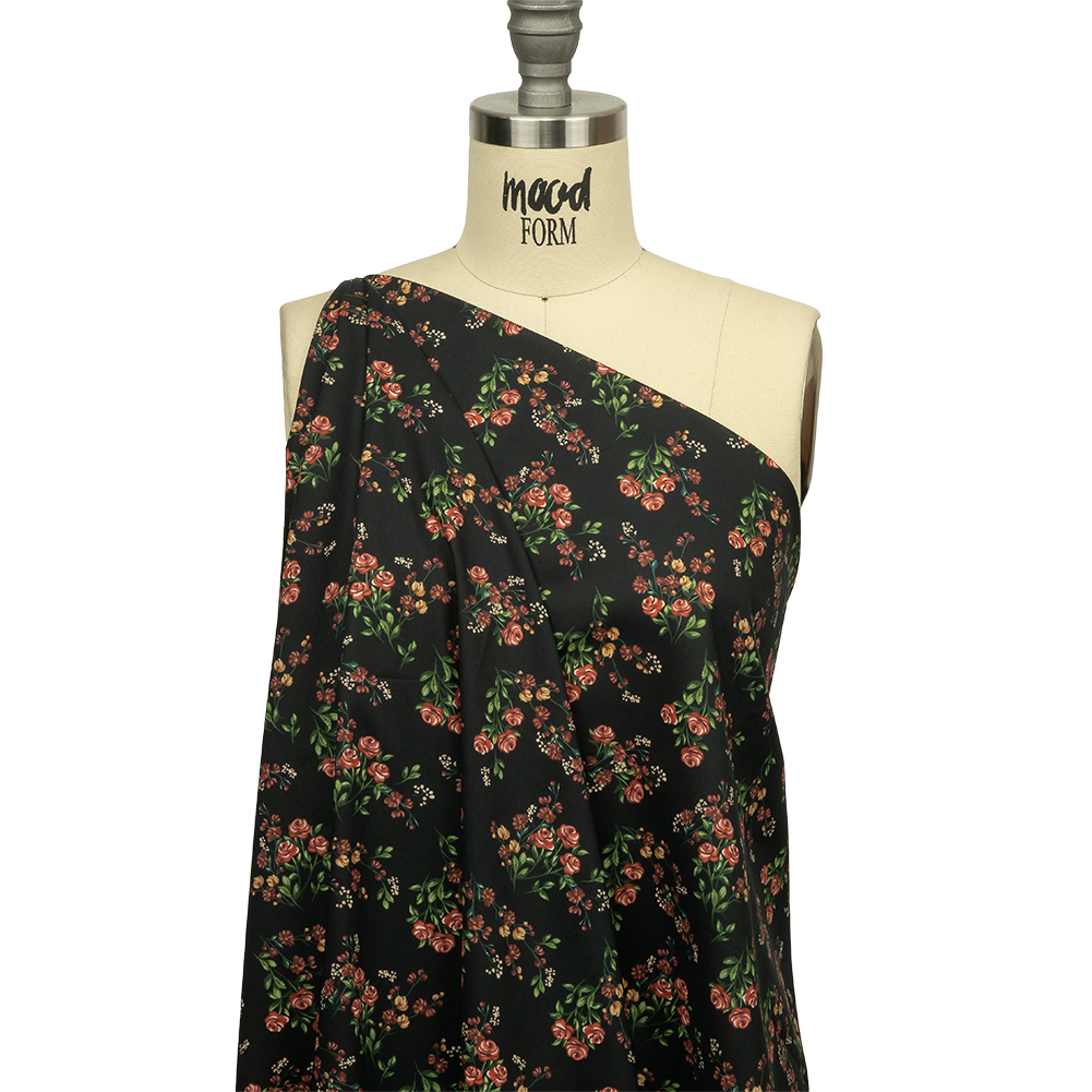 You've gathered a little bouquet and found there are no vases to be had. Maybe a mason jar would be the perfect vessel for the flowers in our Mood Exclusive Mason Jar Bouquet Cotton Voile, featuring red and dark gold flowers on green stems, all on a rich black background. Part of The Rockland Collection, cotton voile is a sweet, romantic material with a soft, airy hand and a billowing drape. Create shirred blouses, loose-fit sundresses, or whimsical skirts. Highly translucent, a lining may be desired for added structure and modesty depending on its application. Swing by our Mood Sewciety Blog to take a glance at over 300 free sewing patterns for more inspiration. For cotton voile, we recommend the Bridgerton Dress, Wilder Top, and Caraway Blouse.MoodEarth Verified: BCI, or Better Cotton Initiative, focuses on the exchange of good practices, including economic, environmental, and social concerns, in the production of cotton. For more information on Mood's sustainability initiatives, check out MoodEarth here.