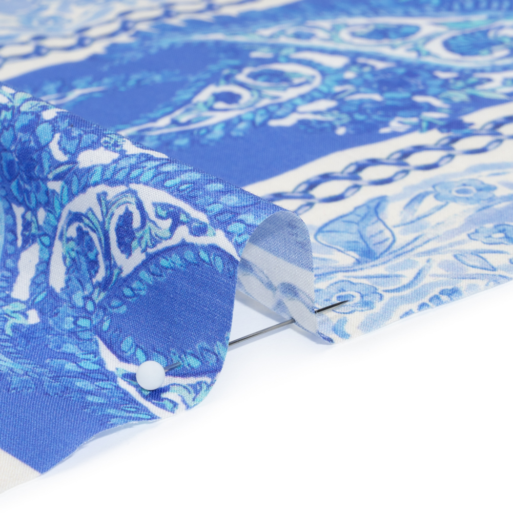 Buon viaggio! Set sail in this Blue Sicilian Summer Cotton Voile Panel, featuring a dry hand, airy drape, and sheer face—perfect for stunning summer styles.Suggested Projects: Dresses, Skirts, TopsContent: 100% CottonStretch: No StretchOpacity: TransparentSicily was once a hub of textile production, with various Mediterranean influences and a strategic location that made it a natural bridge between Africa and Europe. Let this cotton voile be a bridge between you and your perfect euro-summer… just sit back and sip an Aperol Spritz under the scorching Italian sun in the Mediterranean-inspired print. Intricately painted white tiles fill the space, with paisley and florals swimming off their bounds (just as you’ll be swimming in the salty sea), creating a seemingly seamless pattern across the royal blue and white landscape. Highly breathable and moisture-absorbent, this fabric from The Chariot Collection makes dressing for summer events a breeze. The cotton voile's dry, grainy texture exudes a relaxed charm, encouraging the creation of romantic maxi skirts, billowing sundresses, fresh blouses, and more. As it is transparent, a lining may be necessary for certain applications. Please Note: This fabric is sold by the panel, measuring 23 inches long by 55 inches wide.