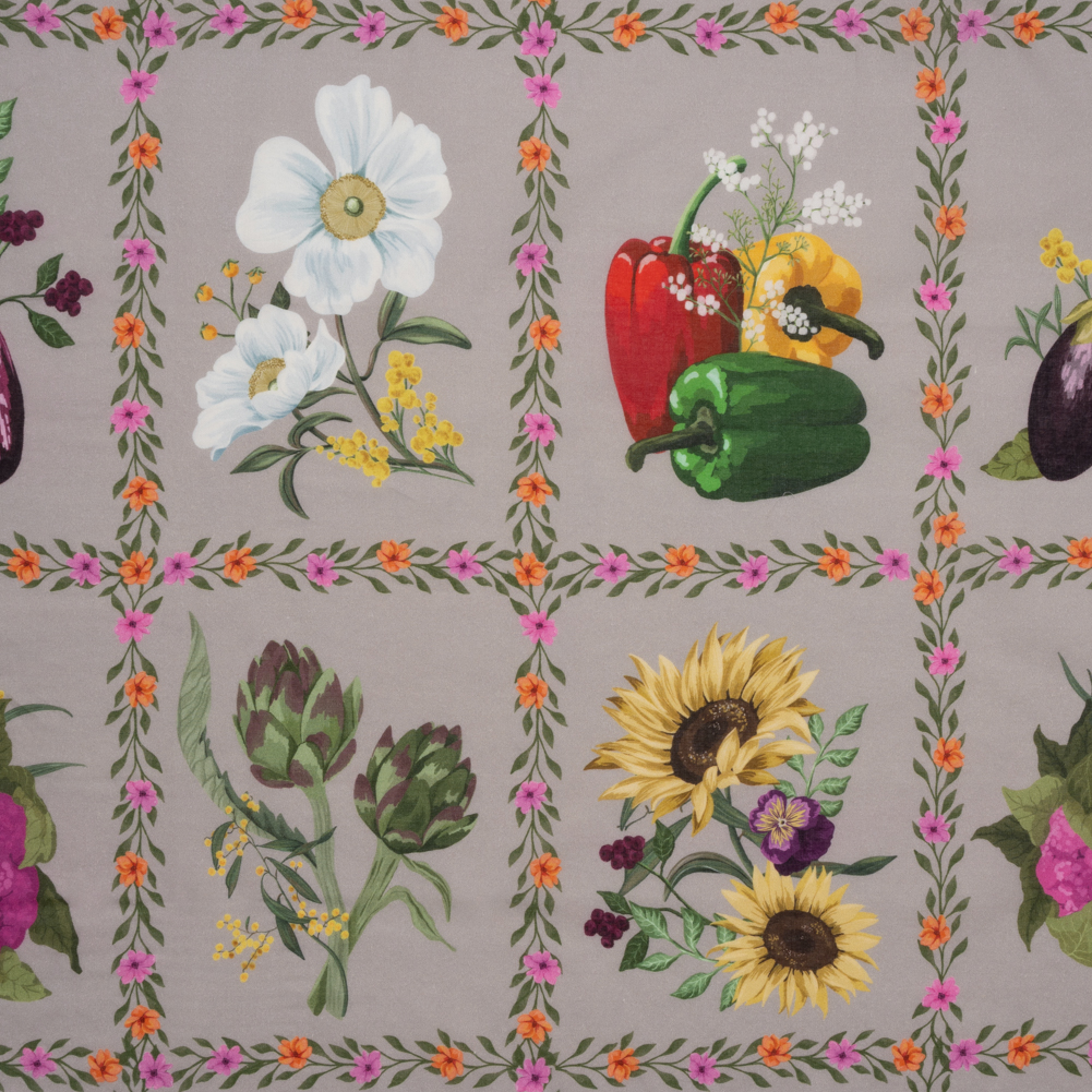 Cotton Voile Print – Beige, Yellow and Purple Floral and Vegetable Grid – Mood Exclusive Sunday with Nonna