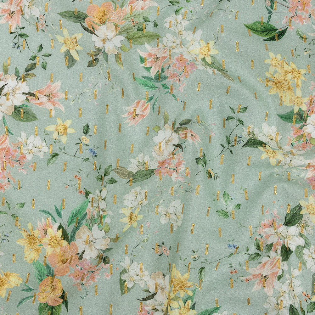 Our Mood Exclusive Seafoam Bewitching Bliss Metallic Cotton Voile will put a spell on you! On a minty green ground, pale flowers bloom in shades of white, pink, and yellow, surrounded by verdant leaves.