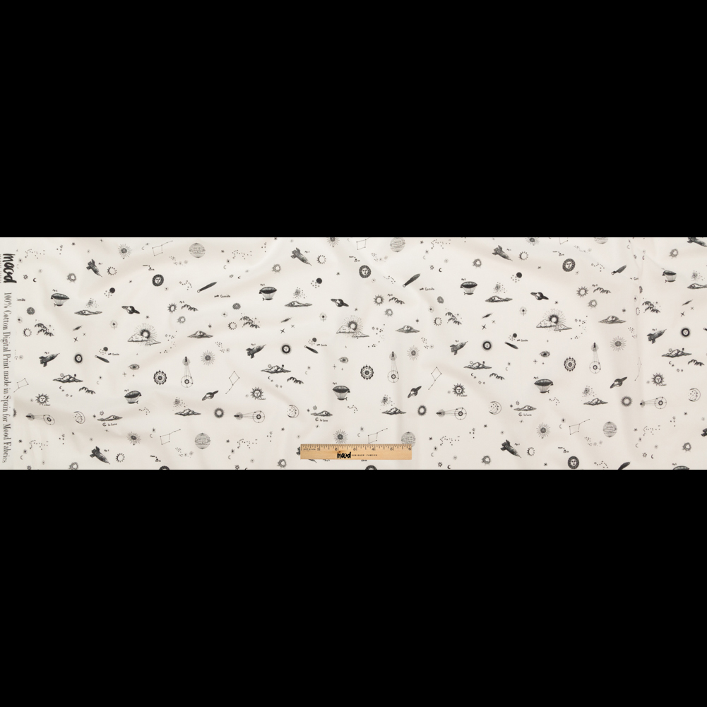 Look up to the symbol-filled night sky to seek out what our Future That Awaits Us Cotton Voile has in-store. Create blouses, dresses, skirts, lightweight scarves, or even curtains as this fabric offers a blend of comfort, elegance, and breathability.Suggested Projects: Pants, Skirts, Unconventional Suitings, DressesContent: 100&#37 CottonStretch: 10% WeftwiseOpacity: Semi TranslucentUnleashing an ultra-soft touch, this near-featherweight medium holds a crisp hand while bestowing a matte complexion. Having a knack for drawing perspiration away from the body along with anti-static and breathable qualities, expect to fall in love! As an asset to our Crow Collection, the digitally printed pattern showcases a collection of galactic wonders. Crafted with a tightly woven plain weave, this fabric features cylindrical-combed yarns made from meticulously groomed fibers running in precise parallel alignment, resulting in a robust, smooth-surfaced material. Its semi-fluid drape makes it ideal for creating versatile fashion garments, lightweight home decor, and more. From full-bodied garments to gathered styles and flowing drapery, the possibilities are endless with this versatile fabric.