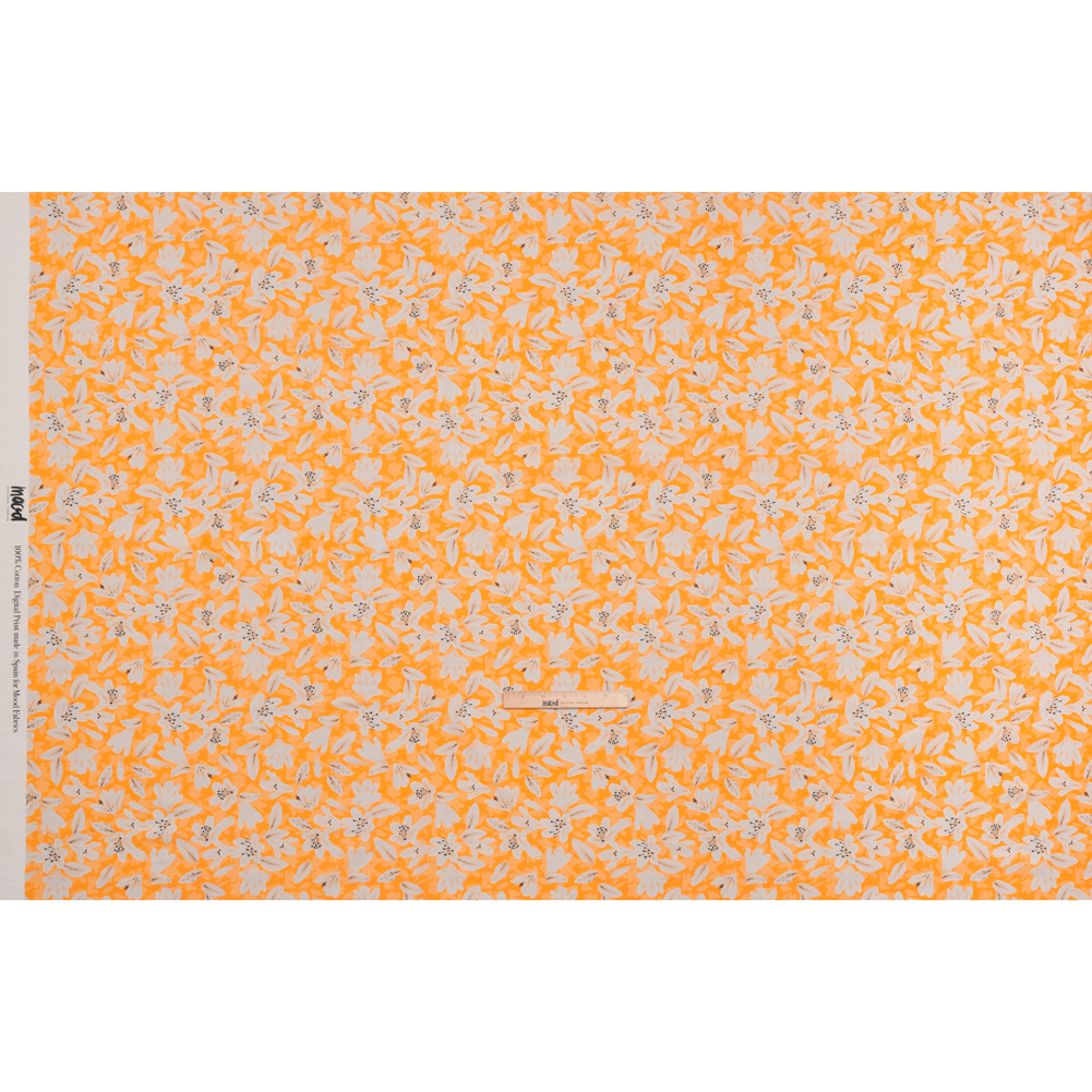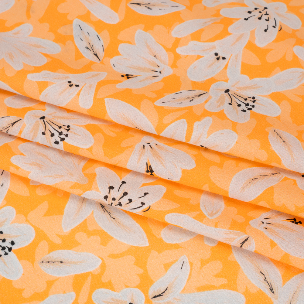 Greet the rising sun in this Yellow Daybreak Bloom Cotton Voile, featuring a dry hand, airy drape, and sheer face—ideal for stunning summer styles.Suggested Projects: Dresses, Skirts, TopsContent: 100% CottonStretch: No StretchOpacity: TransparentJust as a sunrise is the sign of new beginnings, so are lilies representative of renewal and transience. Symbolic of all that is new and ever changing, the gentle white lilies blowing in the breeze against a bright orange background remind you to make the most of each new day. Highly breathable and moisture-absorbent, this fabric from The Chariot Collection makes dressing for summer events a breeze. The cotton voile's dry, grainy texture exudes a relaxed charm, encouraging the creation of romantic maxi skirts, billowing sundresses, fresh blouses, and more. As it is transparent, a lining may be necessary for certain applications.