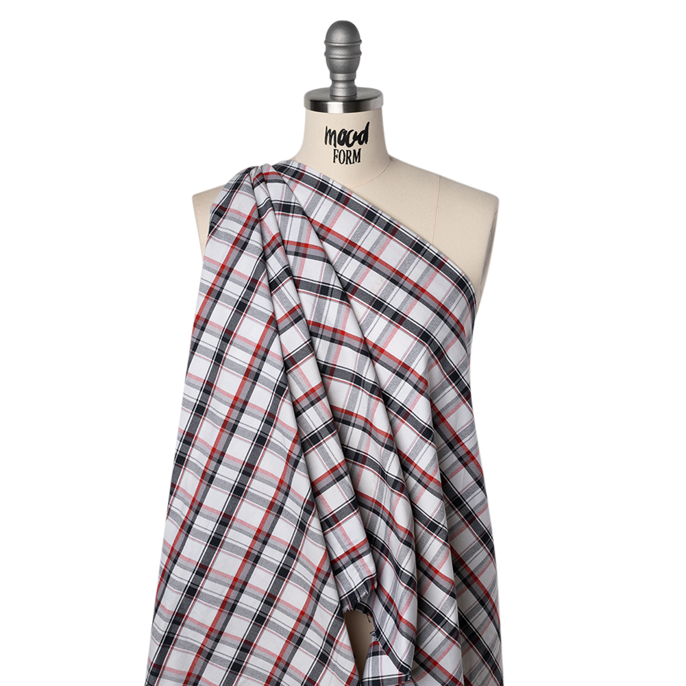This Plaid Cotton Woven is sure to plaid-er your senses—featuring a soft, lightly tactile hand and supple drape.Suggested Projects: Shirts, Vests, Shorts, SkirtsContent: CottonStretch: NoneOpacity: Slightly TranslucentMidnight blue and red threads cross a warm white ground, forming a timeless plaid that balances classic charm with modern ease. Composed of cotton fibers, it’s breathable, soft, and gently textured to the touch, with a supple, easy drape. Perfect for preppy button-downs, tailored vests, playful shorts, and pleated skirts that bring comfort to every step. Slightly translucent, add a lining for extra coverage and a more structured finish.