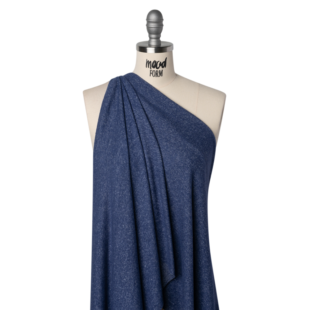 Dream under the starlit sky of this Heathered Cadet Blue Cozy Brushed Stretch Rayon Sweater Knit—featuring a super soft hand and fluid drape.Suggested Projects: Cardigans, Pants, Skirts, LoungewearContent: 74% Rayon, 21% Polyester, 5% ElastaneStretch: 75% Weftwise, 50% WarpwiseOpacity: TranslucentThis heathered cadet blue knit is a uniform you’ll never want to take off. A brushed finish gives this sweater knit a luxuriously soft, fuzzy hand and a fluid drape, making it perfect for the coziest of creations. Its moderate all-way stretch invites slinky cardigans, flowing wide-leg pants, wrap skirts, and the softest loungewear—ideal for crisp autumn days or relaxing nights in. Translucent, we recommend layering or self-lining for full opacity.