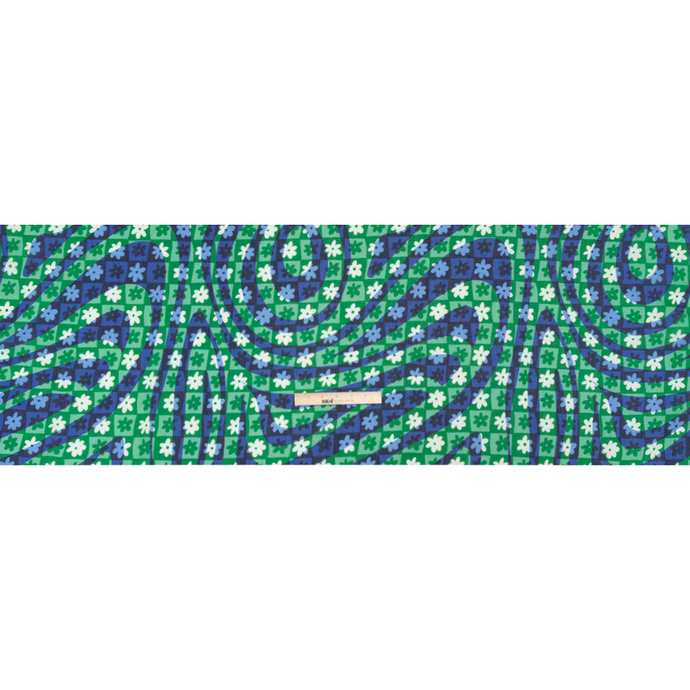 Have fun playing around with our Mood Exclusive Green Gardener’s Game Crinkled Cotton Gauzy Woven! Daisies decorate a blue checkerboard as a fluid green haze swirls and dances over top.
