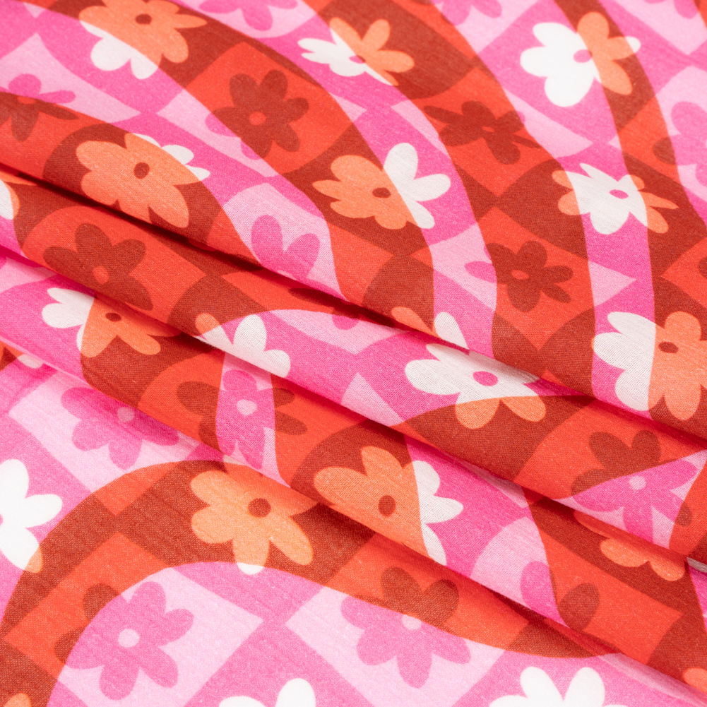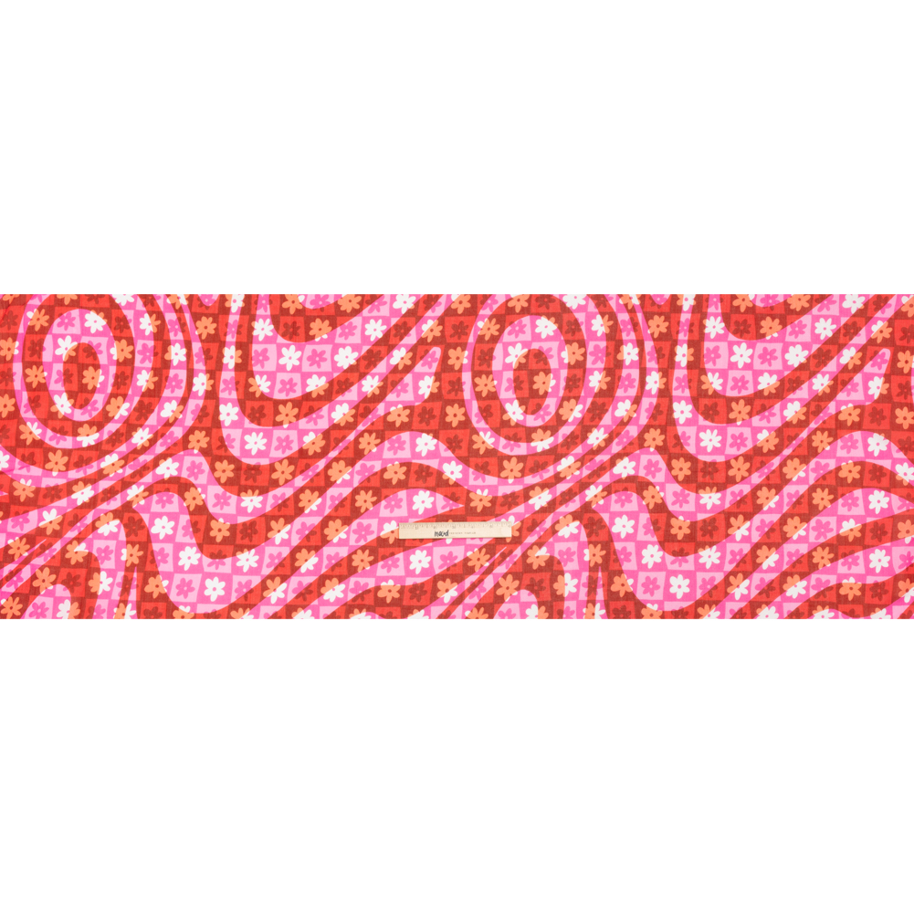Have fun playing around with our Mood Exclusive Red Gardener’s Game Crinkled Cotton Gauzy Woven! Daisies decorate a pink checkerboard as a fluid red haze swirls and dances over top.