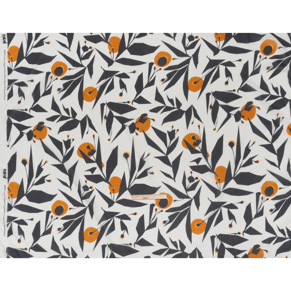 Our Mood Exclusive Fractal Foliage Crinkled Cotton Gauzy Woven looks good from any angle—featuring a slight stretch, dry hand, and airy drape.Suggested Projects: Blouses, Tops, Skirts, DressesContent: 100% CottonStretch: 15% WeftwiseOpacity: SheerGeometric leaves and stems stretch across a crisp white background, their sharp angles softened by the smooth, rounded orbs of bright and burnt orange that break up the design—creating a striking contrast between organic shapes and bold color. Highly breathable and moisture absorbent, this fabric makes dressing for summer events a breeze—and any casual event, for that matter. Its dry, slightly grainy hand and airy drape encourage clean silhouettes and lightweight ensembles, from romantic maxi skirts and sundresses to flowing tank tops and breezy blouses. Plus, it's perfect for the beginner sewist—just remember to prewash it (as cotton is prone to shrinkage), pin it before cutting, and finish all edges to prevent fraying! As it is sheer, a lining may be necessary for certain applications.Please Note: The dye lot of this fabric has changed as of November 2025. If you had previously ordered this material, please order a swatch to ensure the new dye lot meets your color requirements.