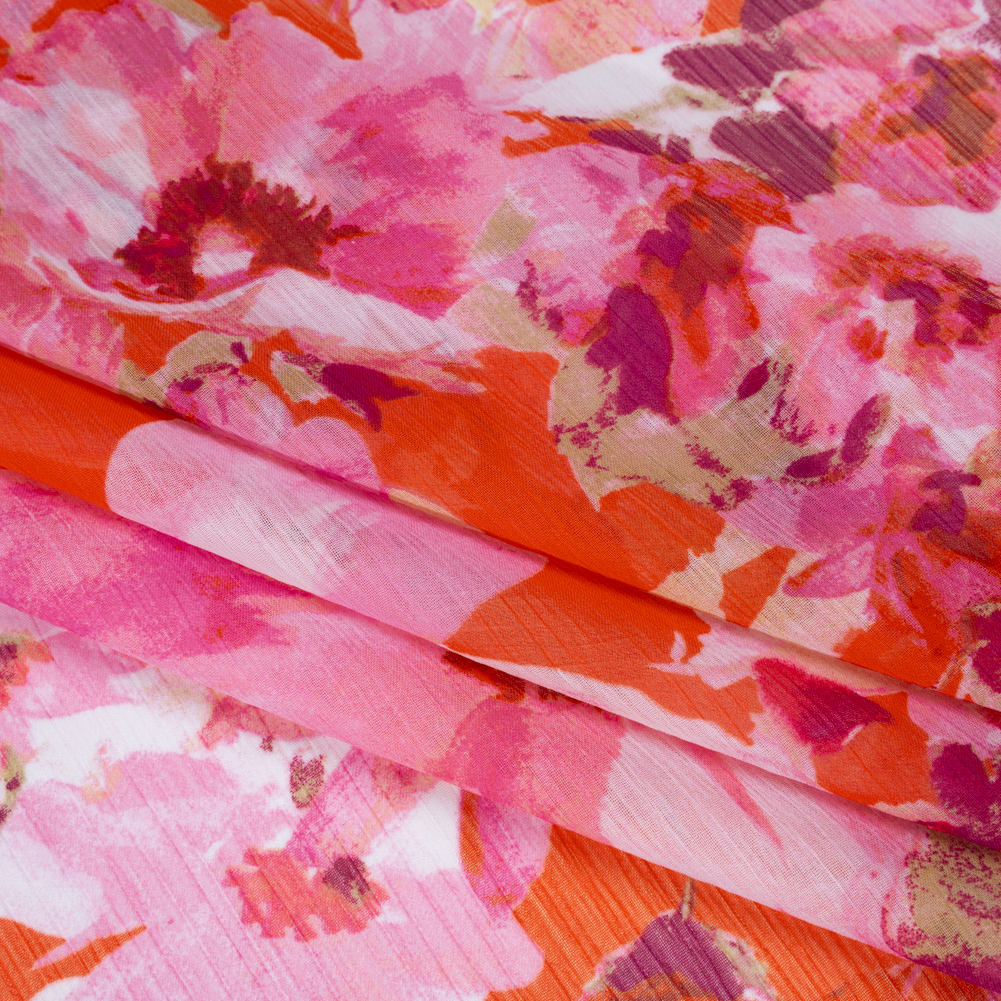 Crinkled Polyester Chiffon Print - Pink, Coral and Fuchsia Watercolor Flowers - Designer Deadstock