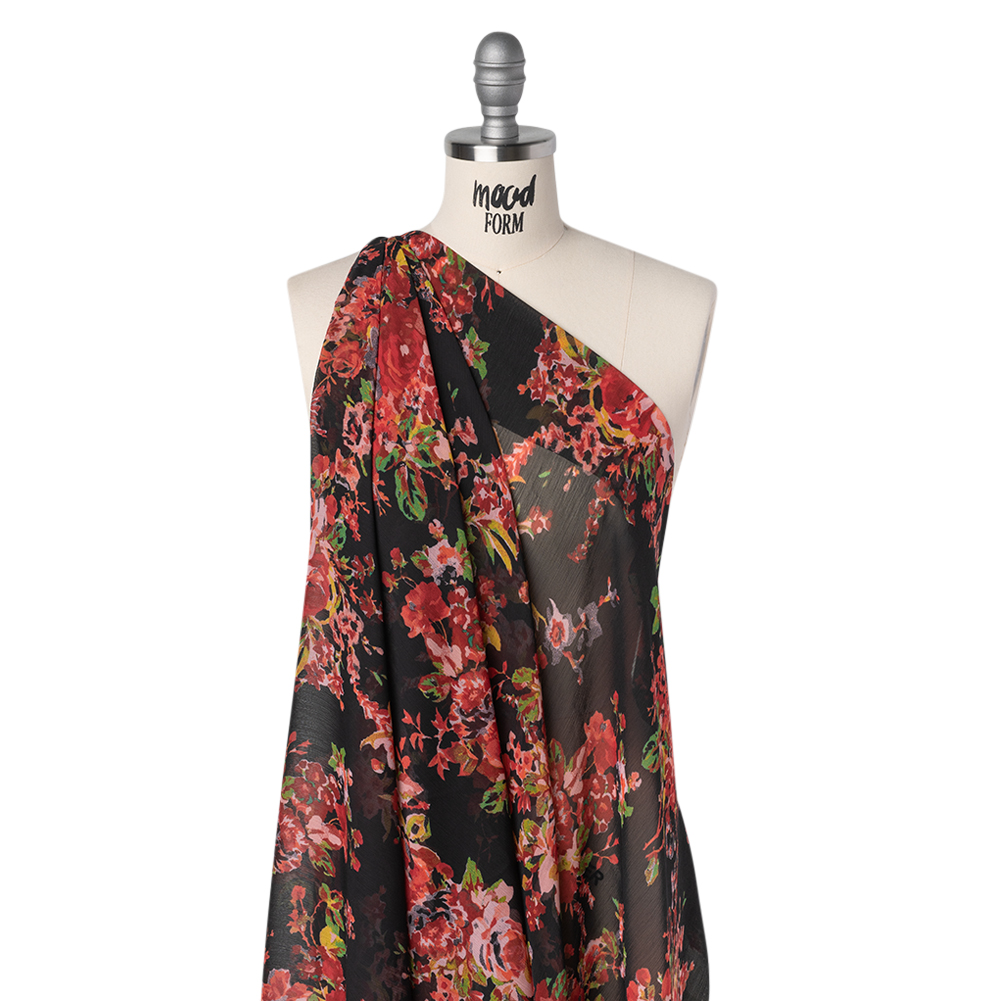 Lean into romantic inspirations when working with this Floral Crinkled Polyester Chiffon Print—featuring a dry hand and fluid drape.Suggested Projects: Dresses, Skirts, Shirts, BlousesContent: 100% PolyesterStretch: NoneOpacity: SheerBright red roses with lush green leaves bloom in gathered bouquets across a black background. Lightweight with a dry, crinkled hand and fluid yet airy drape, it’s destined for ethereal overlays, sweeping evening gowns, floaty summer dresses, delicate scarves, and whisper-soft blouses. Sheer and without stretch, a lining may be added for opacity and form depending on your design.