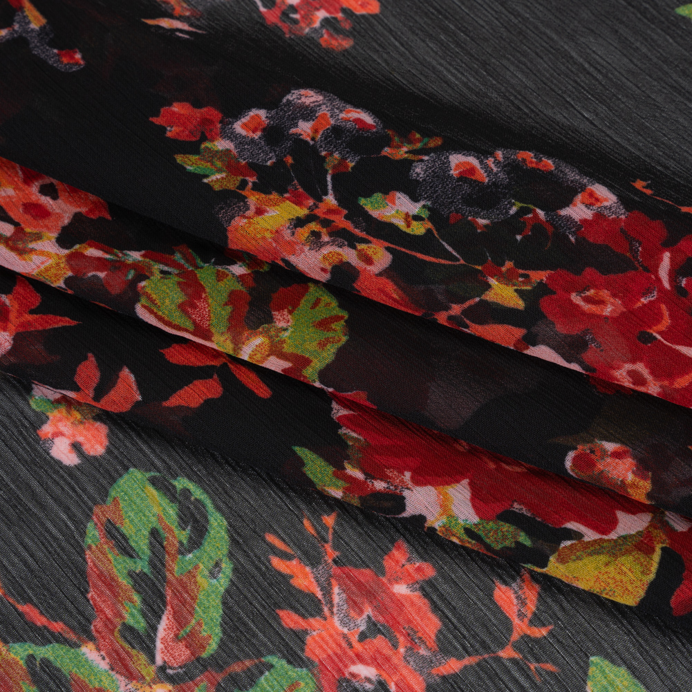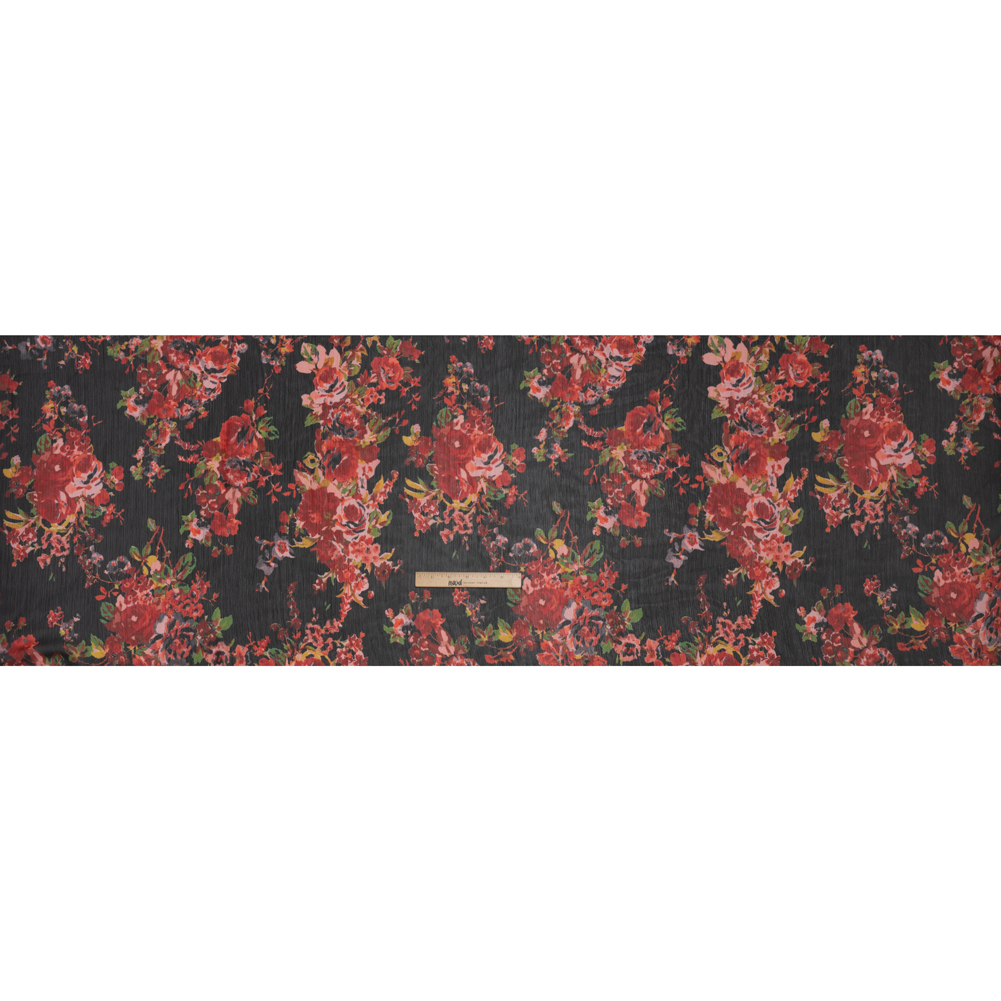 Crinkled Polyester Chiffon Print – Red, Green and Black Floral – Designer Deadstock
