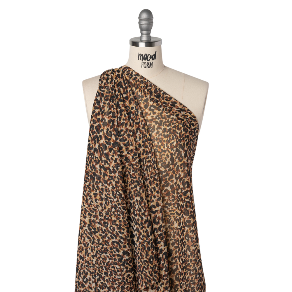 Stitch some safari-style into your designs with this Abstract Animal Spots Crinkled Polyester Chiffon Print with Metallic Gold Pinstripes—featuring a dry, crinkled hand and airy drape.Suggested Projects: Dresses, Skirts, Blouses, ShawlsContent: 100% PolyesterStretch: NoneOpacity: SheerAbstract black, brown, and beige spots layer atop one another in a bold animal-print design, while delicate metallic gold pinstripes add a subtle, glimmering touch of enchantment. With a dry, crinkled hand and fluid drape, this fabric is perfect for ethereal overlays, twilight-ready evening gowns, fluttering scarves, tiered skirts, and sheer, whisper-light blouses. Sheer and without stretch, a lining can be added if you desire a bit more coverage or structure.
