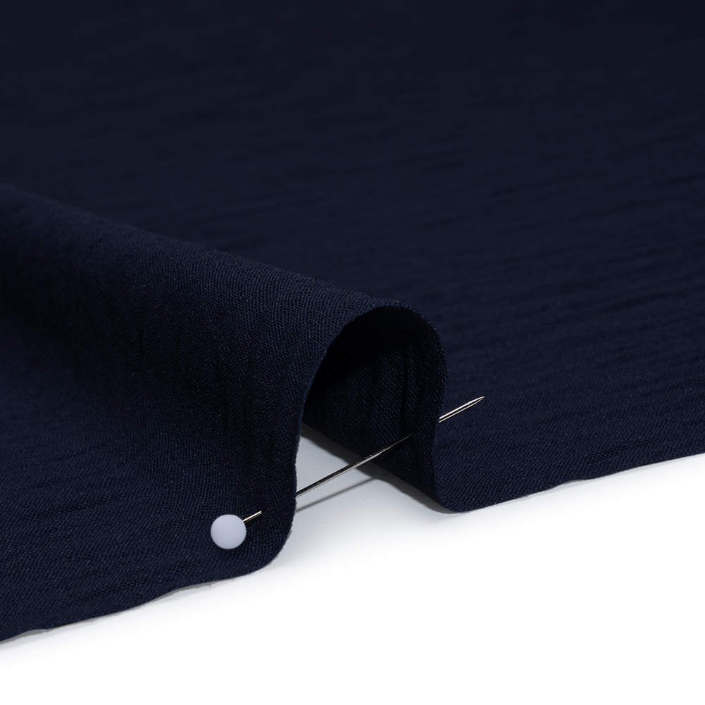 Dress your best for days on the yacht in this True Navy Crinkled Polyester Crepe—featuring a soft, tactile hand and fluid drape.Suggested Projects: Shirts, Dresses, Skirts, PantsContent: 100% PolyesterStretch: 25% WarpwiseOpacity: Slightly TranslucentThis true navy blue crinkled polyester crepe yearns to flow like the unruly ocean waves across your designs. An extraordinarily soft and supple hand complemented by a pleasing, subtle texture features a slight stretch through the weft and warp. This polyester crepe is incredibly breathable and is perfect for summer garments such as billowy camp shirts, t-shirt dresses, tiered skirts, and more. Slightly translucent, a lining or layering is recommended for true opacity.
