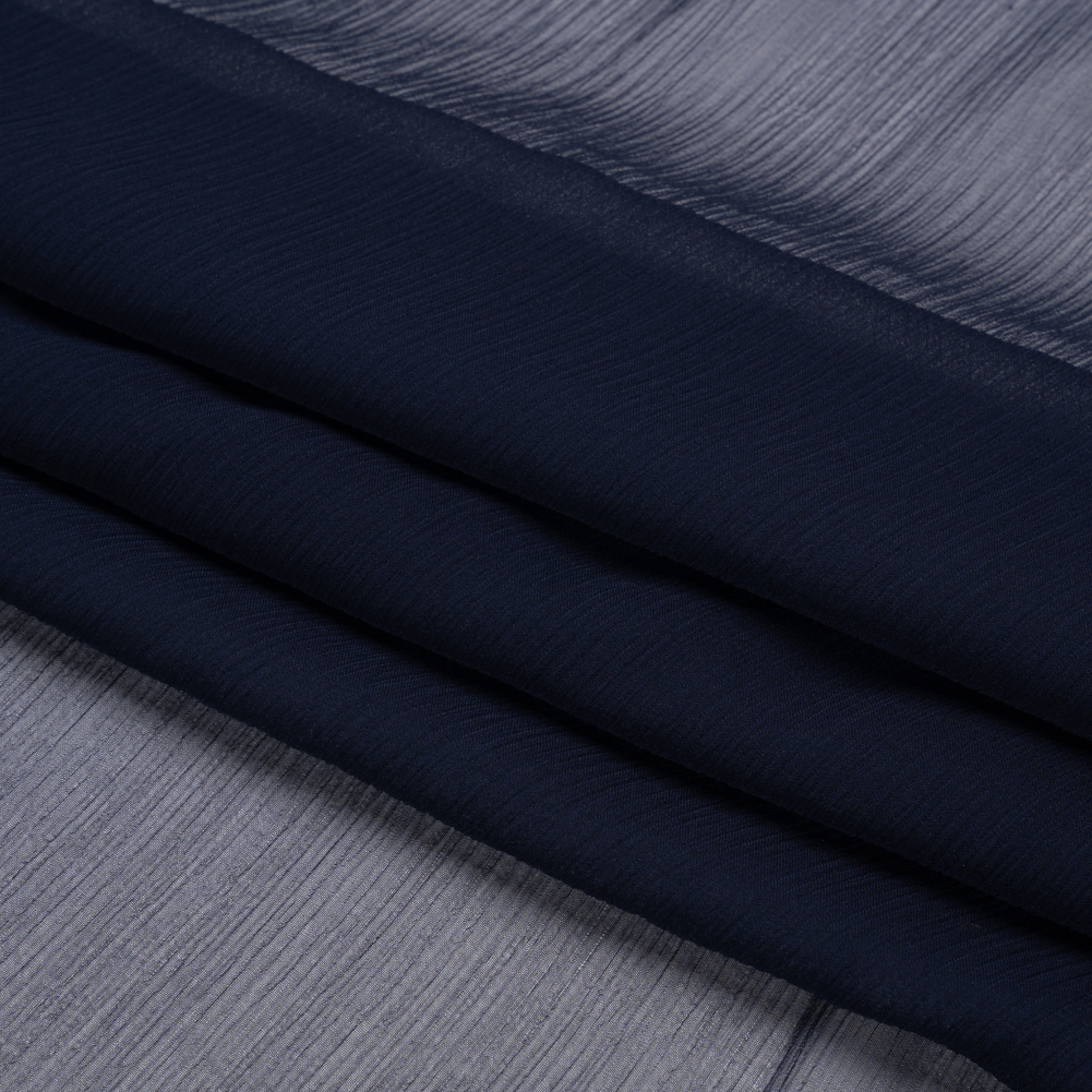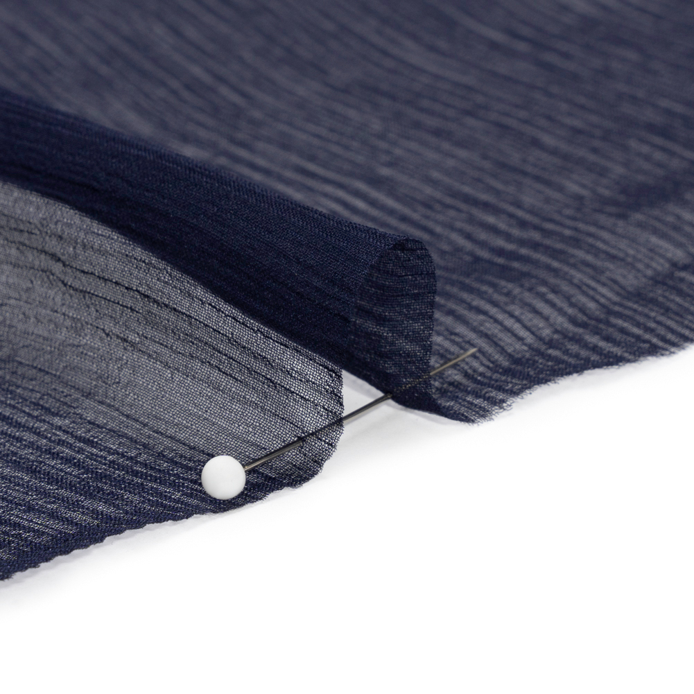 Mood's Crinkled Silk Chiffon - Navy - Premium Collection is a sheer, lightweight and ethereal fabric with a subtle, crinkled texture. An excellent choice for fluid, top-weight garments, overlays, flowing scarves, and sheer insets such as ruffle details and draped extensions. Note: Dye lots are subject to change up to 10% in either direction. Ordering swatches is HIGHLY recommended for these products.