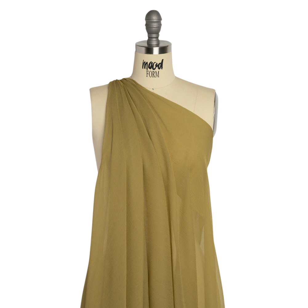 Mood's Crinkled Silk Chiffon - Sage Green - Premium Collection is a sheer, lightweight and ethereal fabric with a subtle, crinkled texture. An excellent choice for fluid, top-weight garments, overlays, flowing scarves, and sheer insets such as ruffle details and draped extensions. Note: Dye lots are subject to change up to 10% in either direction. Ordering swatches is HIGHLY recommended for these products.