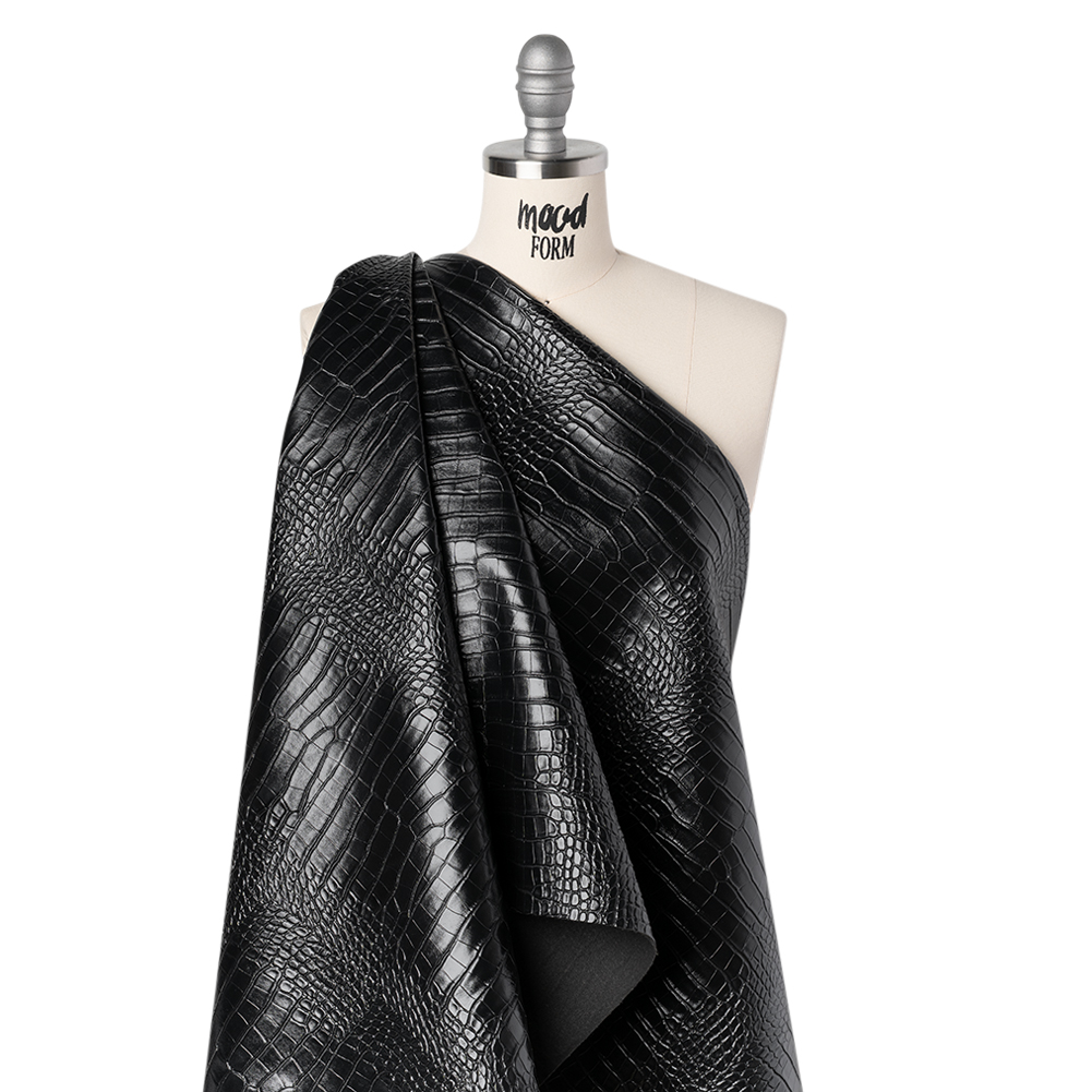 Stake your claim on tantalizing designs with this Black Crocodile Faux Leather Vinyl—featuring a tactile hand and slightly structured drape.Suggested Projects: Jackets, Skirts, Handbags, Lightweight UpholsteryContent: 70% PVC, 30% PolyesterStretch: NoneOpacity: OpaqueTake a croc at this black faux leather vinyl, where a cracked, crocodile-skin-like surface adds texture, intrigue, and undeniable attitude to your designs. Its glossy, tactile hand and slightly structured drape make it the perfect material for fearless fashion statements and statement-making interiors alike. Picture sleek biker jackets, structured mini skirts, and couture handbags strutting down the runway—or barstools and throw pillows transforming a space into a modern design dream. Opaque, a lining isn’t necessary but may be added to ensure structure and a polished finish. WARNING: Cancer and Reproductive Harm - www.P65Warnings.ca.gov.