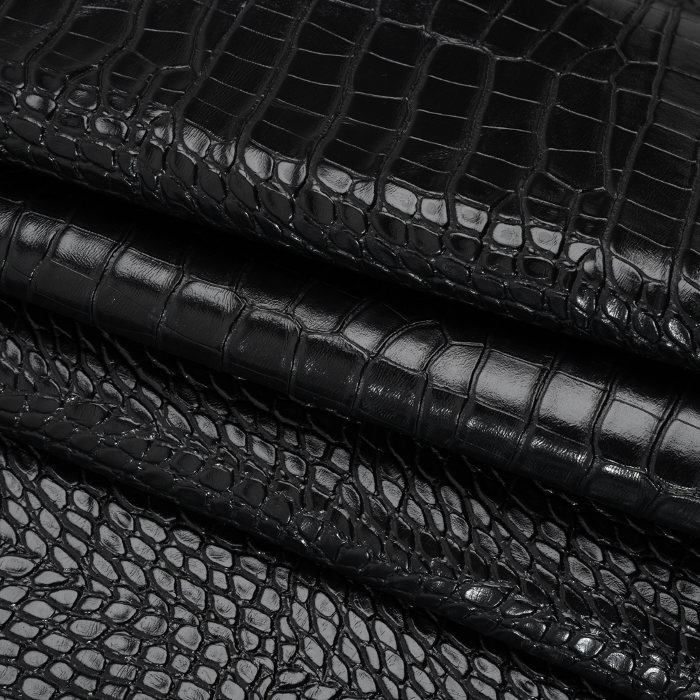 Stake your claim on tantalizing designs with this Black Crocodile Faux Leather Vinyl—featuring a tactile hand and slightly structured drape.