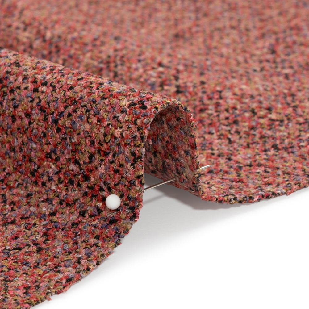 Create either accent pieces or statement pieces with this exciting Crypton Berry Tweedy Stain Resistant Upholstery Boucle! The face is densely populated with small red, tan, pink, black, and purple dots, creating a soft and pebbly hand that feels similar to a tweed.